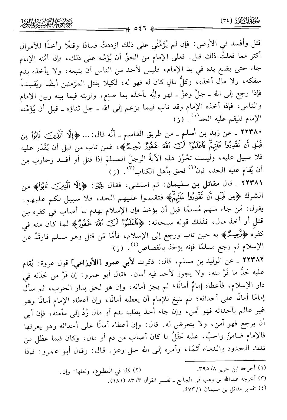 ٢٢٣٨٠ - عن زيد بن أسلم -من طريق القاسم- أنّه قال: ... {إلا الذين تابوا من قبل أن تقدروا عليهم فاعلموا أن الله غفور رحيم}، فمن تاب من قبل أن يُقْدَر عليه فلا سبيل عليه، وليست تحْرُز هذه الآيةُ الرجلَ المسلمَ إذا قتل أو أفسد وحارب مِن أن يُقام عليه الحد، فإن (¬٢) لحق بأهل الكتاب (¬٣). (ز)