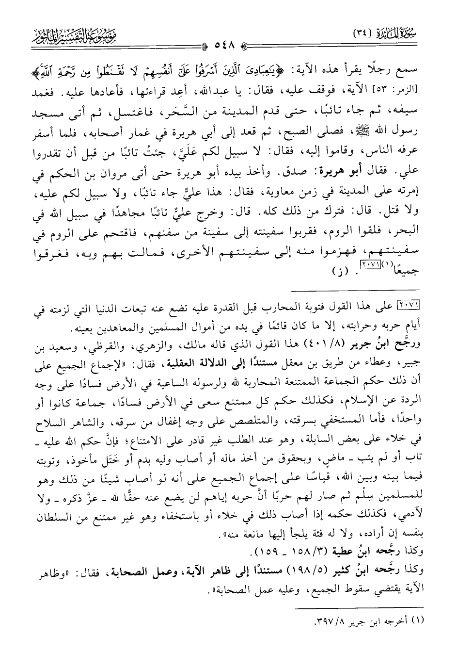 ورجَّح ابنُ جرير (٨/ ٤٠١) هذا القول الذي قاله مالك، والزهري، والقرظي، وسعيد بن جبير، وعطاء من طريق بن معقل مستندًا إلى الدلالة العقلية، فقال: «لإجماع الجميع على أن ذلك حكم الجماعة الممتنعة المحاربة لله ولرسوله الساعية في الأرض فسادًا على وجه الردة عن الإسلام، فكذلك حكم كل ممتنع سعى في الأرض فسادًا، جماعة كانوا أو واحدًا، فأما المستخفي بسرقته، والمتلصص على وجه إغفال من سرقه، والشاهر السلاح في خلاء على بعض السابلة، وهو عند الطلب غير قادر على الامتناع؛ فإنّ حكم الله عليه -تاب أو لم يتب- ماضٍ، وبحقوق من أخذ ماله أو أصاب وليه بدم أو خَتَل مأخوذ، وتوبته فيما بينه وبين الله، قياسًا على إجماع الجميع على أنه لو أصاب شيئًا من ذلك وهو للمسلمين سِلْم ثم صار لهم حربًا أنّ حربه إياهم لن يضع عنه حقًّا لله -عزَّ ذكره- ولا لآدمي، فكذلك حكمه إذا أصاب ذلك في خلاء أو باستخفاء وهو غير ممتنع من السلطان بنفسه إن أراده، ولا له فئة يلجأ إليها مانعة منه».