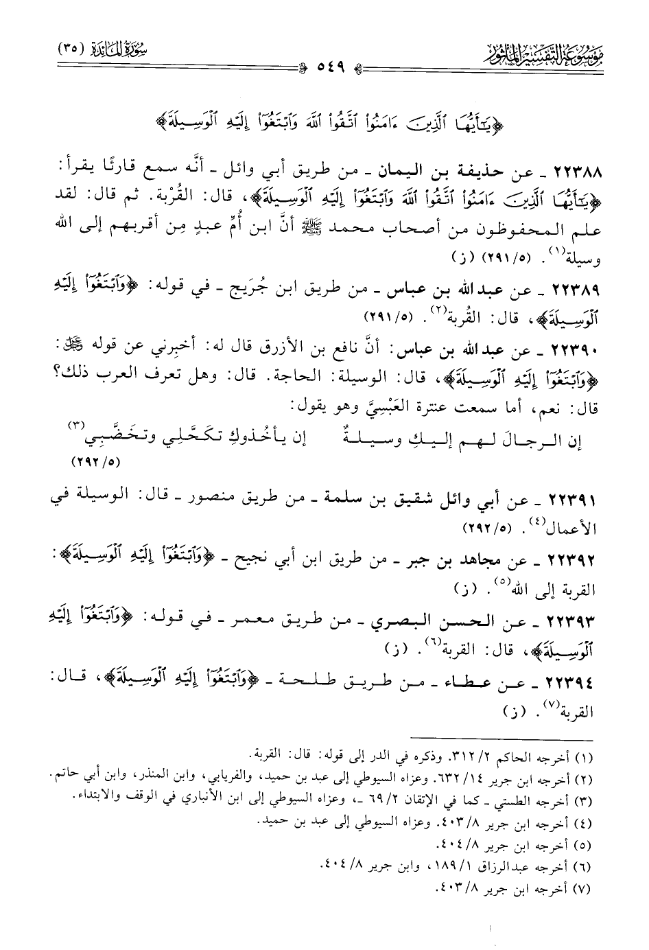 ٢٢٣٩٤ - عن عطاء -من طريق طلحة- {وابتغوا إليه الوسيلة}، قال: القربة (¬٧). (ز)