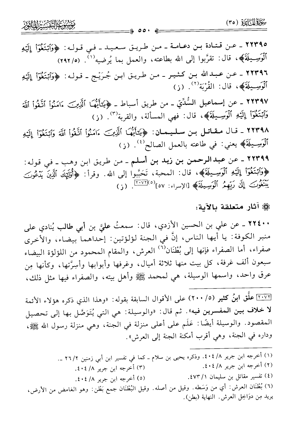 ٢٢٣٩٥ - عن قتادة بن دعامة -من طريق سعيد- في قوله: {وابتغوا إليه الوسيلة}، قال: تقرَّبوا إلى الله بطاعته، والعمل بما يُرضيه (¬١). (٥/ ٢٩٢)