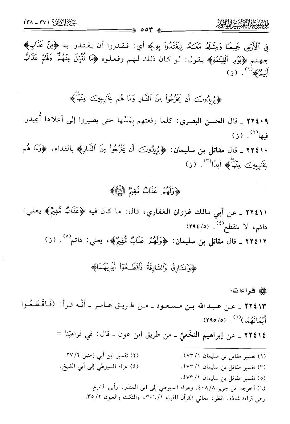 ٢٢٤١٠ - قال مقاتل بن سليمان: {يُرِيدُونَ أنْ يَخْرُجُوا مِنَ النّارِ} بالفداء، {وما هُمْ بِخارِجِينَ مِنها} أبدًا (¬٣). (ز)