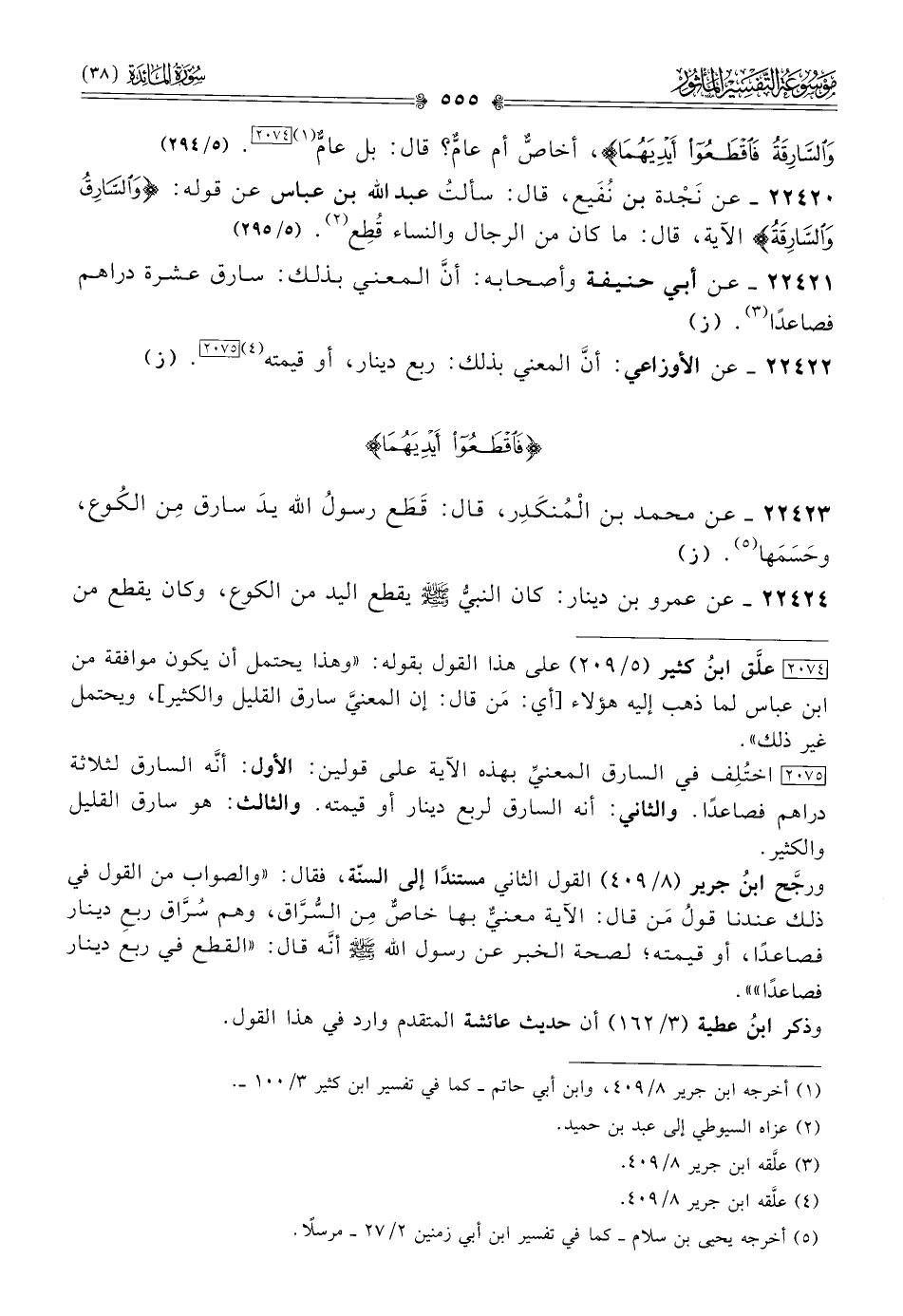 [٢٠٧٤] علَّق ابنُ كثير (٥/ ٢٠٩) على هذا القول بقوله: «وهذا يحتمل أن يكون موافقة من ابن عباس لما ذهب إليه هؤلاء [أي: مَن قال: إن المعنيَّ سارق القليل والكثير]، ويحتمل غير ذلك».