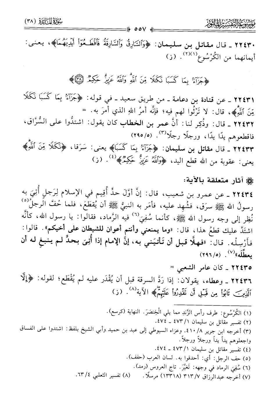 ٢٢٤٣٠ - قال مقاتل بن سليمان: {والسّارِقُ والسّارِقَةُ فاقْطَعُوا أيْدِيَهُما}، يعنى: أيمانهما من الكُرْسُوع (¬١) (¬٢).