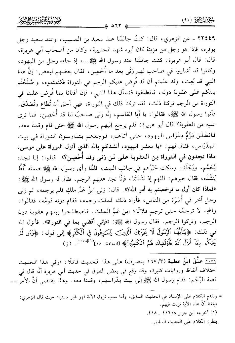 ٢٢٤٤٩ - عن الزهري، قال: كنتُ جالسًا عند سعيد بن المسيب، وعند سعيد رجل يوقره، فإذا هو رجل من مزينة كان أبوه شهد الحديبية، وكان من أصحاب أبي هريرة، قال: قال أبو هريرة: كنت جالسًا عند رسول الله - صلى الله عليه وسلم - ... ، إذ جاءه رجل من اليهود، وكانوا قد أشاروا في صاحب لهم زَنى بعد ما أُحْصِن، فقال بعضهم لبعض: إنّ هذا النبي قد بُعِث، وقد علمتم أن قد فُرِض عليكم الرجم في التوراة فكتمتموه، واصَّلَحْتُم بينكم على عقوبة دونه، فانطلقوا فنسأل هذا النبي، فإن أفتانا بما فُرِض علينا في التوراة من الرجم تركنا ذلك، فقد تركنا ذلك في التوراة، فهي أحق أن تُطاع وتُصَدَّق. فأتوا رسول الله - صلى الله عليه وسلم -، فقالوا: يا أبا القاسم، إنّه زنى صاحبٌ لنا قد أُحْصِن، فما ترى عليه من العقوبة؟ قال أبو هريرة: فلم يرجع إليهم رسول الله - صلى الله عليه وسلم - حتى قام وقمنا معه، فانطلق يَؤُمُّ مِدْراس اليهود، حتى أتاهم، فوجدهم يتدارسون التوراة في بيت المِدْراس، فقال لهم: «يا معشر اليهود، أنشدكم بالله الذي أنزل التوراة على موسى، ماذا تجدون في التوراة مِن العقوبة على مَن زنى وقد أُحْصِن؟». قالوا: إنا نجده يُحَمَّم، ويُجْلَد. وسكت حَبْرُهم في جانب البيت، فلمّا رأى رسول الله - صلى الله عليه وسلم - صمتَه ألَظَّ يَنشُدُه، فقال حبرهم: اللهم إذ نَشَدْتَنا، فإنّا نجد عليهم الرجم. فقال له رسول الله - صلى الله عليه وسلم -: «فماذا كان أول ما ترخصتم به أمر الله؟». قال: زنى ابنُ عَمِّ ملكٍ فلم يرجمه، ثم زنى رجل آخر في أُسْرَة من الناس، فأراد ذلك الملك رجمه، فقام دونه قومُه، فقالوا: واللهِ، لا ترجمْه حتى ترجم فلانًا؛ ابنَ عَمِّ الملك. فاصطلحوا بينهم عقوبة دون الرجم، وتركوا الرجم. فقال رسول الله - صلى الله عليه وسلم -: «فإني أقضي بما في التوراة». فأنزل الله في ذلك: {يا أيها الرسول لا يحزنك الذين يسارعون في الكفر} إلى قوله: {ومن لم يحكم بما أنزل الله فأولئك هم الكافرون} (¬١) [٢٠٧٨]. (ز)