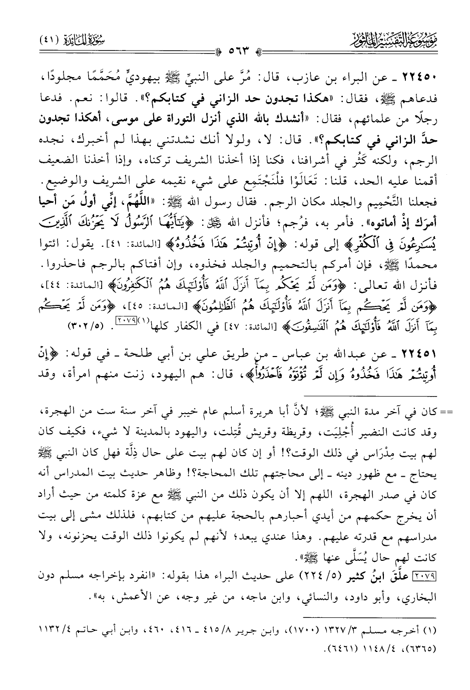 ٢٢٤٥٠ - عن البراء بن عازب، قال: مُرَّ على النبي - صلى الله عليه وسلم - بيهوديٍّ مُحَمَّمًا مجلودًا، فدعاهم - صلى الله عليه وسلم -، فقال: «هكذا تجدون حد الزاني في كتابكم؟». قالوا: نعم. فدعا رجلًا من علمائهم، فقال: «أنشدك بالله الذي أنزل التوراة على موسى، أهكذا تجدون حدَّ الزاني في كتابكم؟». قال: لا، ولولا أنك نشدتني بهذا لم أخبرك، نجده الرجم، ولكنه كَثُر في أشرافنا، فكنا إذا أخذنا الشريف تركناه، وإذا أخذنا الضعيف أقمنا عليه الحد، قلنا: تَعالَوْا فلْنَجْتَمِع على شيء نقيمه على الشريف والوضيع. فجعلنا التَّحْمِيم والجلد مكان الرجم. فقال رسول الله - صلى الله عليه وسلم -: «اللَّهُمَّ، إنِّي أولُ مَن أحيا أمرَك إذْ أماتوه». فأمر به، فرُجم؛ فأنزل الله - عز وجل -: {يا أيها الرسول لا يحزنك الذين يسارعون في الكفر} إلى قوله: {إن أوتيتم هذا فخذوه} [المائدة: ٤١]. يقول: ائتوا محمدًا - صلى الله عليه وسلم -، فإن أمركم بالتحميم والجلد فخذوه، وإن أفتاكم بالرجم فاحذروا. فأنزل الله تعالى: {ومن لم يحكم بما أنزل الله فأولئك هم الكافرون}، {ومن لم يحكم بما أنزل الله فأولئك هم الظالمون}، {ومن لم يحكم بما أنزل الله فأولئك هم الفاسقون} في الكفار كلها (¬١) [٢٠٧٩].