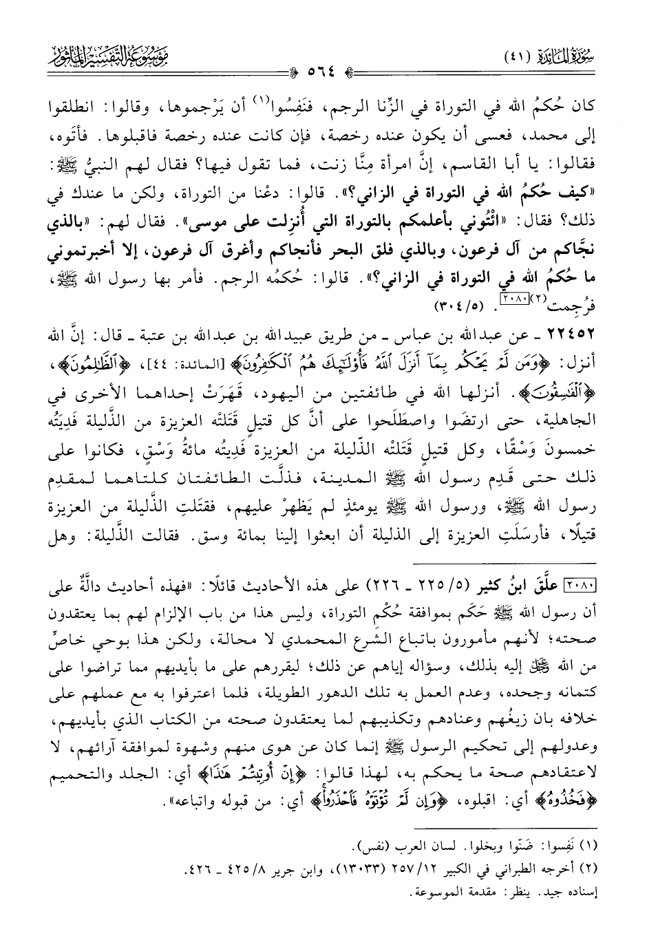 ٢٢٤٥٢ - عن عبد الله بن عباس -من طريق عبيد الله بن عبد الله بن عتبة- قال: إنّ الله أنزل: {ومن لم يحكم بما أنزل الله فأولئك هم الكافرون}، {الظالمون}، {الفاسقون}. أنزلها الله في طائفتين من اليهود، قَهَرَتْ إحداهما الأخرى في الجاهلية، حتى ارتضَوا واصطَلَحوا على أنّ كل قتيلٍ قَتَلتْه العزيزة من الذَّليلة فَدِيَتُه خمسونَ وسْقًا، وكل قتيلٍ قَتَلتْه الذّليلة من العزيزة فَدِيتُه مائةُ وسْقٍ، فكانوا على ذلك حتى قَدِم رسول الله - صلى الله عليه وسلم - المدينة، فذلَّت الطائفتان كلتاهما لمقدِم رسول الله - صلى الله عليه وسلم -، ورسول الله - صلى الله عليه وسلم - يومئذٍ لم يَظهرْ عليهم، فقتَلتِ الذَّليلة من العزيزة قتيلًا، فأرسَلَتِ العزيزة إلى الذليلة أن ابعثوا إلينا بمائة وسق. فقالت الذَّليلة: وهل