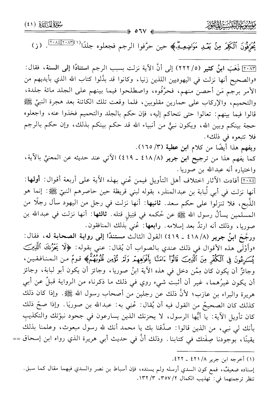 [٢٠٨٤] أفادت الآثار اختلاف أهل التأويل فيمن عُني بهذه الآية على أربعة أقوال: أولها: أنها نزلت في أبي لُبابة بن عبد المنذر، بقوله لبني قريظة حين حاصرهم النبيّ - صلى الله عليه وسلم -: إنما هو الذَّبح، فلا تنزلوا على حكم سعد. ثانيها: أنها نزلت في رجل من اليهود سأل رجلًا من المسلمين يسألُ رسول الله - صلى الله عليه وسلم - عن حُكمه في قتِيلٍ قتله. ثالثها: أنها نزلت في عبد الله بن صوريا، وذلك أنه ارتدَّ بعد إسلامه. رابعها: عُني بذلك المنافقون. ورجَّحَ ابنُ جرير (٨/ ٤١٨ - ٤١٩) القولَ الثالث مستندًا إلى رواية الصحابة له، فقال: «وأَوْلى هذه الأقوال في ذلك عندي بالصواب أن يُقال: عني بقوله: {لا يحزنك الذين يسارعون في الكفر من الذين قالوا آمنا بأفواههم ولم تؤمن قلوبهم} قومٌ من المنافقين، وجائزٌ أن يكون كان مِمَّن دخل في هذه الآية ابنُ صوريا، وجائز أن يكون أبو لبابة، وجائز أن يكون غيرُهما، غير أن أثبت شيء روي في ذلك ما ذكرناه من الرواية قبلُ عن أبي هريرة والبراء بن عازب؛ لأنّ ذلك عن رجلين من أصحاب رسول الله - صلى الله عليه وسلم -. وإذا كان ذلك كذلك كان الصحيحُ من القول فيه أن يُقال: عُنِي به: عبد الله بن صوريا. وإذا صحّ ذلك كان تأويل الآية: يا أيُّها الرسول، لا يحزنك الذين يسارعون في جحود نبوّتك والتكذيبِ بأنك لي نبي، من الذين قالوا: صدَّقنا بك يا محمد أنك لله رسول مبعوث، وعلمنا بذلك يقينًا، بوجودنا صِفَتك في كتابنا. وذلك أنّ في حديث أبي هريرة الذي رواه ابن إسحاق =