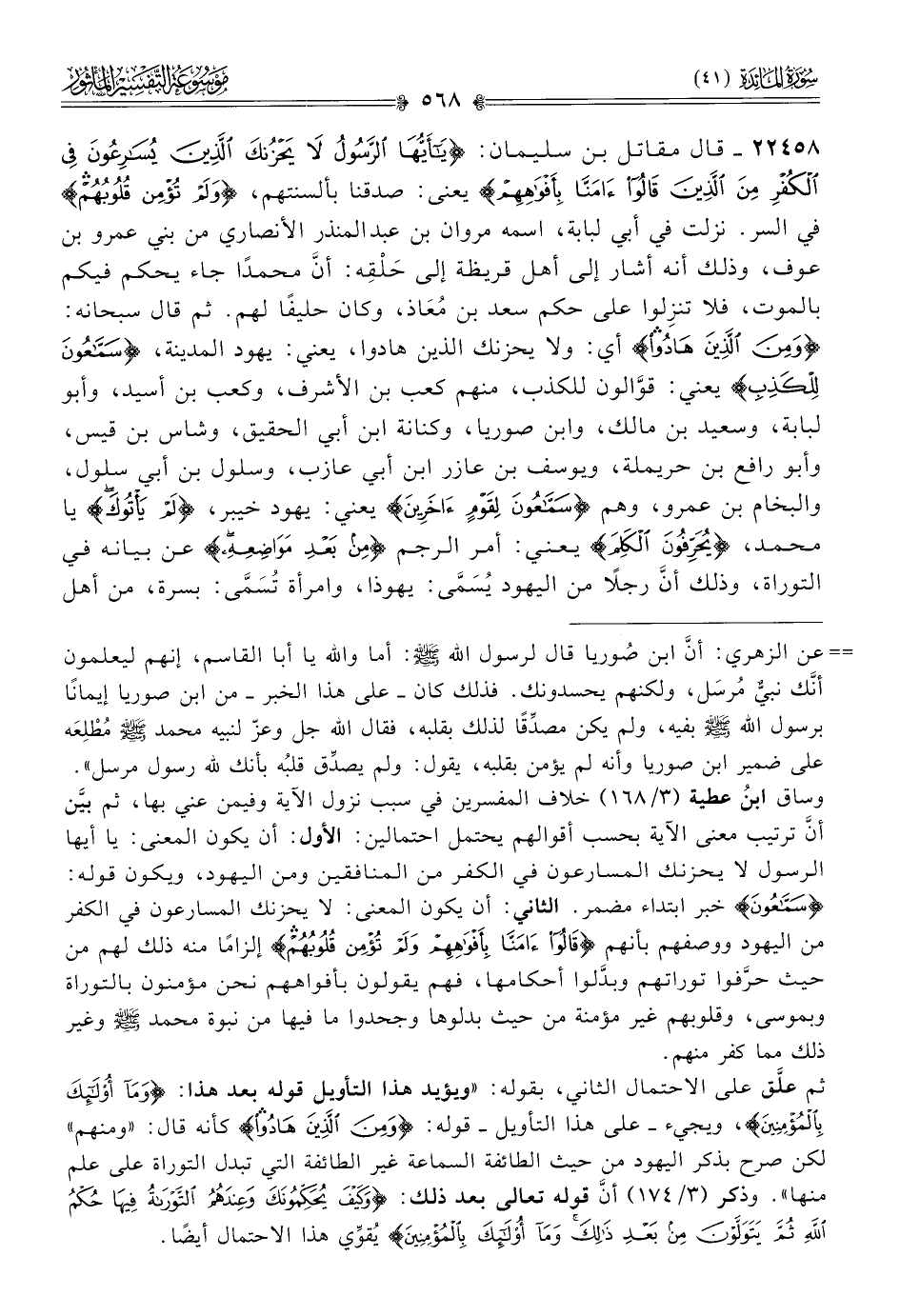 وساق ابنُ عطية (٣/ ١٦٨) خلاف المفسرين في سبب نزول الآية وفيمن عني بها، ثم بيَّن أنّ ترتيب معنى الآية بحسب أقوالهم يحتمل احتمالين: الأول: أن يكون المعنى: يا أيها الرسول لا يحزنك المسارعون في الكفر من المنافقين ومن اليهود، ويكون قوله: {سَمّاعُونَ} خبر ابتداء مضمر. الثاني: أن يكون المعنى: لا يحزنك المسارعون في الكفر من اليهود ووصفهم بأنهم {قالُوا آمَنّا بِأَفْواهِهِمْ ولَمْ تُؤْمِن قُلُوبُهُمْ} إلزامًا منه ذلك لهم من حيث حرَّفوا توراتهم وبدَّلوا أحكامها، فهم يقولون بأفواههم نحن مؤمنون بالتوراة وبموسى، وقلوبهم غير مؤمنة من حيث بدلوها وجحدوا ما فيها من نبوة محمد - صلى الله عليه وسلم - وغير ذلك مما كفر منهم.