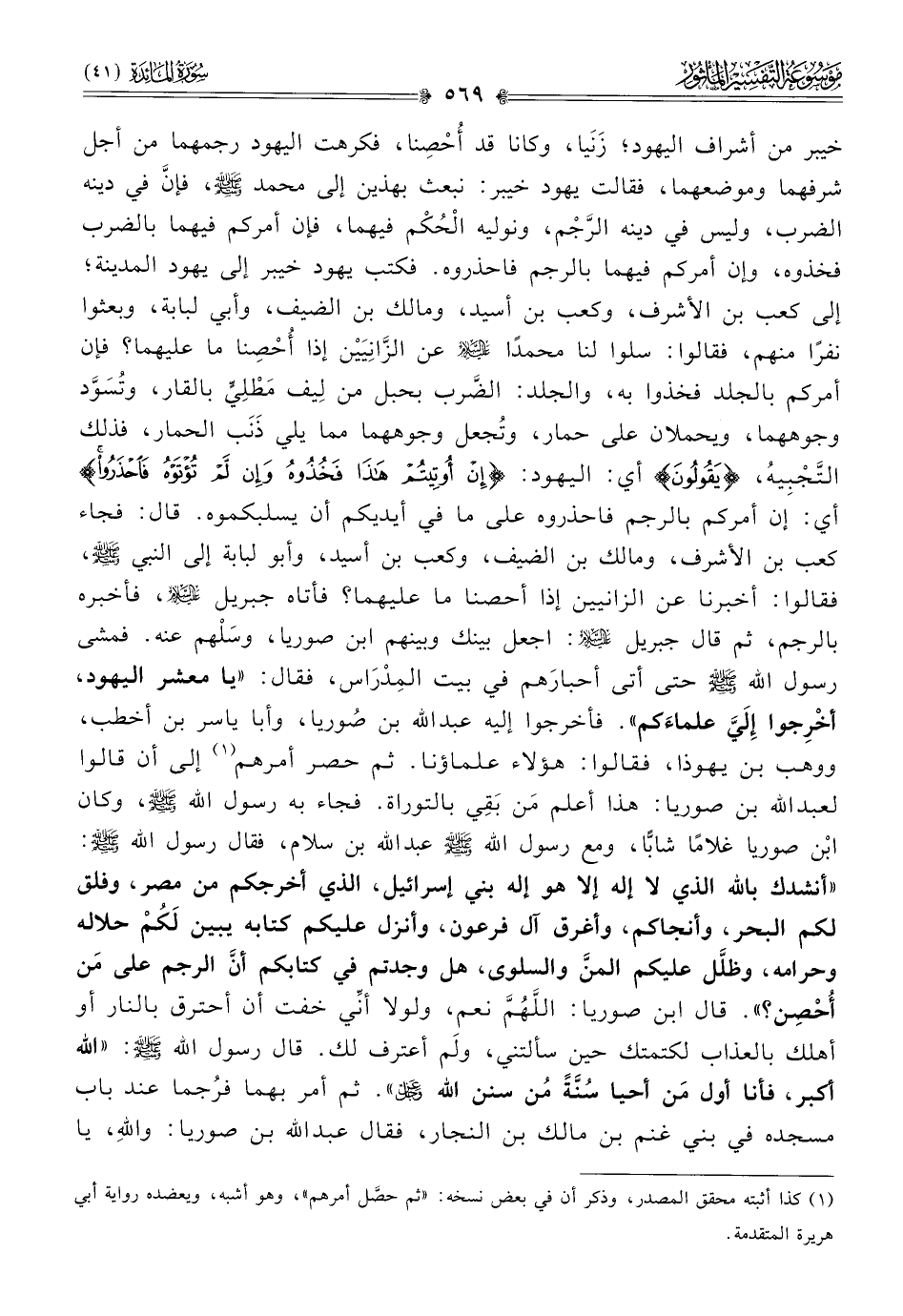 خيبر من أشراف اليهود؛ زَنَيا، وكانا قد أُحْصِنا، فكرهت اليهود رجمهما من أجل شرفهما وموضعهما، فقالت يهود خيبر: نبعث بهذين إلى محمد - صلى الله عليه وسلم -، فإنّ في دينه الضرب، وليس في دينه الرَّجْم، ونوليه الحُكْم فيهما، فإن أمركم فيهما بالضرب فخذوه، وإن أمركم فيهما بالرجم فاحذروه. فكتب يهود خيبر إلى يهود المدينة؛ إلى كعب بن الأشرف، وكعب بن أسيد، ومالك بن الضيف، وأبي لبابة، وبعثوا نفرًا منهم، فقالوا: سلوا لنا محمدًا - عليه السلام - عن الزّانِيَيْن إذا أُحْصِنا ما عليهما؟ فإن أمركم بالجلد فخذوا به، والجلد: الضَّرب بحبل من لِيف مَطْلِيٍّ بالقار، وتُسَوَّد وجوههما، ويحملان على حمار، وتُجعل وجوههما مما يلي ذَنَب الحمار، فذلك التَّجْبِيهُ، {يَقُولُونَ} أي: اليهود: {إنْ أُوتِيتُمْ هَذا فَخُذُوهُ وإنْ لَمْ تُؤْتَوْهُ فاحْذَرُوا} أي: إن أمركم بالرجم فاحذروه على ما في أيديكم أن يسلبكموه. قال: فجاء كعب بن الأشرف، ومالك بن الضيف، وكعب بن أسيد، وأبو لبابة إلى النبي - صلى الله عليه وسلم -، فقالوا: أخبرنا عن الزانيين إذا أحصنا ما عليهما؟ فأتاه جبريل - عليه السلام -، فأخبره بالرجم، ثم قال جبريل - عليه السلام -: اجعل بينك وبينهم ابن صوريا، وسَلْهم عنه. فمشى رسول الله - صلى الله عليه وسلم - حتى أتى أحبارَهم في بيت المِدْراس، فقال: «يا معشر اليهود، أخْرِجوا إلَيَّ علماءَكم». فأخرجوا إليه عبد الله بن صُوريا، وأبا ياسر بن أخطب، ووهب بن يهوذا، فقالوا: هؤلاء علماؤنا. ثم حصر أمرهم (¬١) إلى أن قالوا لعبد الله بن صوريا: هذا أعلم مَن بَقِي بالتوراة. فجاء به رسول الله - صلى الله عليه وسلم -، وكان ابْن صوريا غلامًا شابًّا، ومع رسول الله - صلى الله عليه وسلم - عبد الله بن سلام، فقال رسول الله - صلى الله عليه وسلم -: «أنشدك بالله الذي لا إله إلا هو إله بني إسرائيل، الذي أخرجكم من مصر، وفلق لكم البحر، وأنجاكم، وأغرق آل فرعون، وأنزل عليكم كتابه يبين لَكُمْ حلاله وحرامه، وظلَّل عليكم المنَّ والسلوى، هل وجدتم في كتابكم أنّ الرجم على مَن أُحْصِن؟». قال ابن صوريا: اللَّهُمَّ نعم، ولولا أنِّي خفت أن أحترق بالنار أو أهلك بالعذاب لكتمتك حين سألتني، ولَم أعترف لك. قال رسول الله - صلى الله عليه وسلم -: «الله أكبر، فأنا أول مَن أحيا سُنَّةً مُن سنن الله - عز وجل -». ثم أمر بهما فرُجما عند باب مسجده في بني غنم بن مالك بن النجار، فقال عبد الله بن صوريا: واللهِ، يا