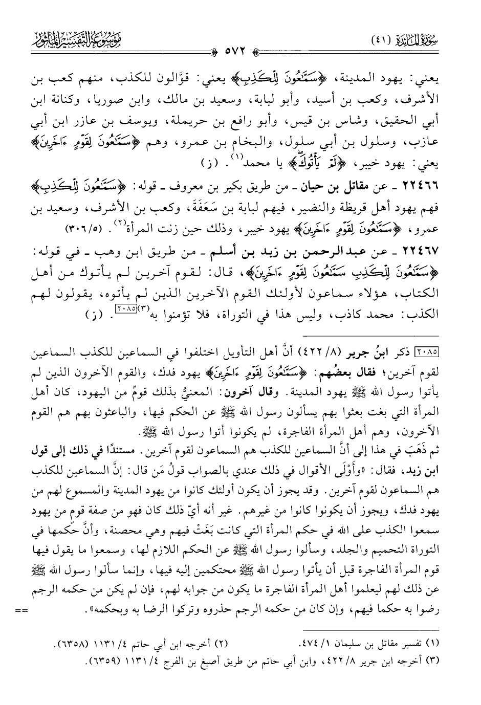 ثم ذَهَبَفي هذا إلى أنّ السماعين للكذب هم السماعون لقوم آخرين. مستندًا في ذلك إلى قول ابن زيد، فقال: «وأَوْلى الأقوال في ذلك عندي بالصواب قولُ مَن قال: إنّ السماعين للكذب هم السماعون لقوم آخرين. وقد يجوز أن يكون أولئك كانوا من يهود المدينة والمسموع لهم من يهود فدك، ويجوز أن يكونوا كانوا من غيرهم. غير أنه أيّ ذلك كان فهو من صفة قومٍ من يهود سمعوا الكذب على الله في حكم المرأة التي كانت بَغَتْ فيهم وهي محصنة، وأنّ حكمها في التوراة التحميم والجلد، وسألوا رسول الله - صلى الله عليه وسلم - عن الحكم اللازم لها، وسمعوا ما يقول فيها قوم المرأة الفاجرة قبل أن يأتوا رسول الله - صلى الله عليه وسلم - محتكمين إليه فيها، وإنما سألوا رسول الله - صلى الله عليه وسلم - عن ذلك لهم ليعلموا أهل المرأة الفاجرة ما يكون من جوابه لهم، فإن لم يكن من حكمه الرجم رضوا به حكما فيهم، وإن كان من حكمه الرجم حذروه وتركوا الرضا به وبحكمه».