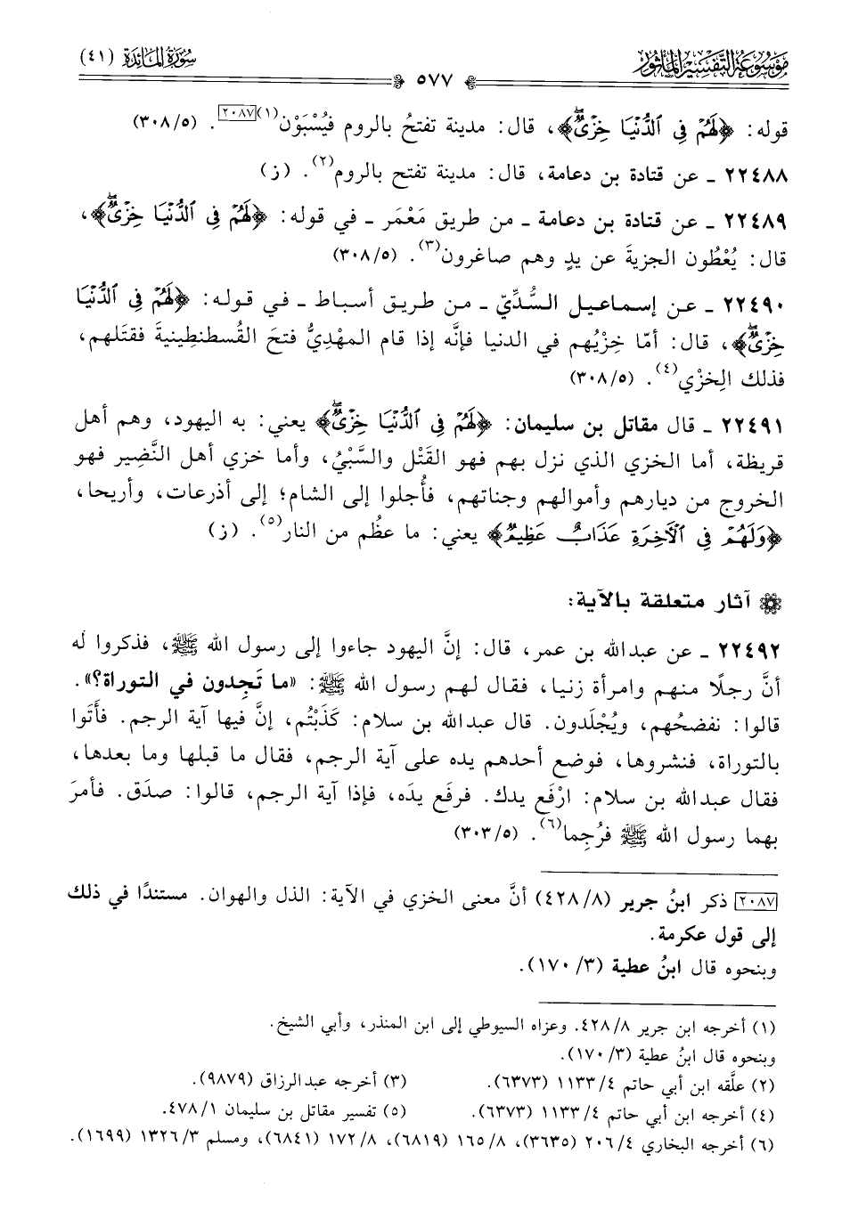 ٢٢٤٨٩ - عن قتادة بن دعامة -من طريق مَعْمَر- في قوله: {لهم في الدنيا خزي}، قال: يُعْطُون الجزيةَ عن يدٍ وهم صاغرون (¬٣). (٥/ ٣٠٨)