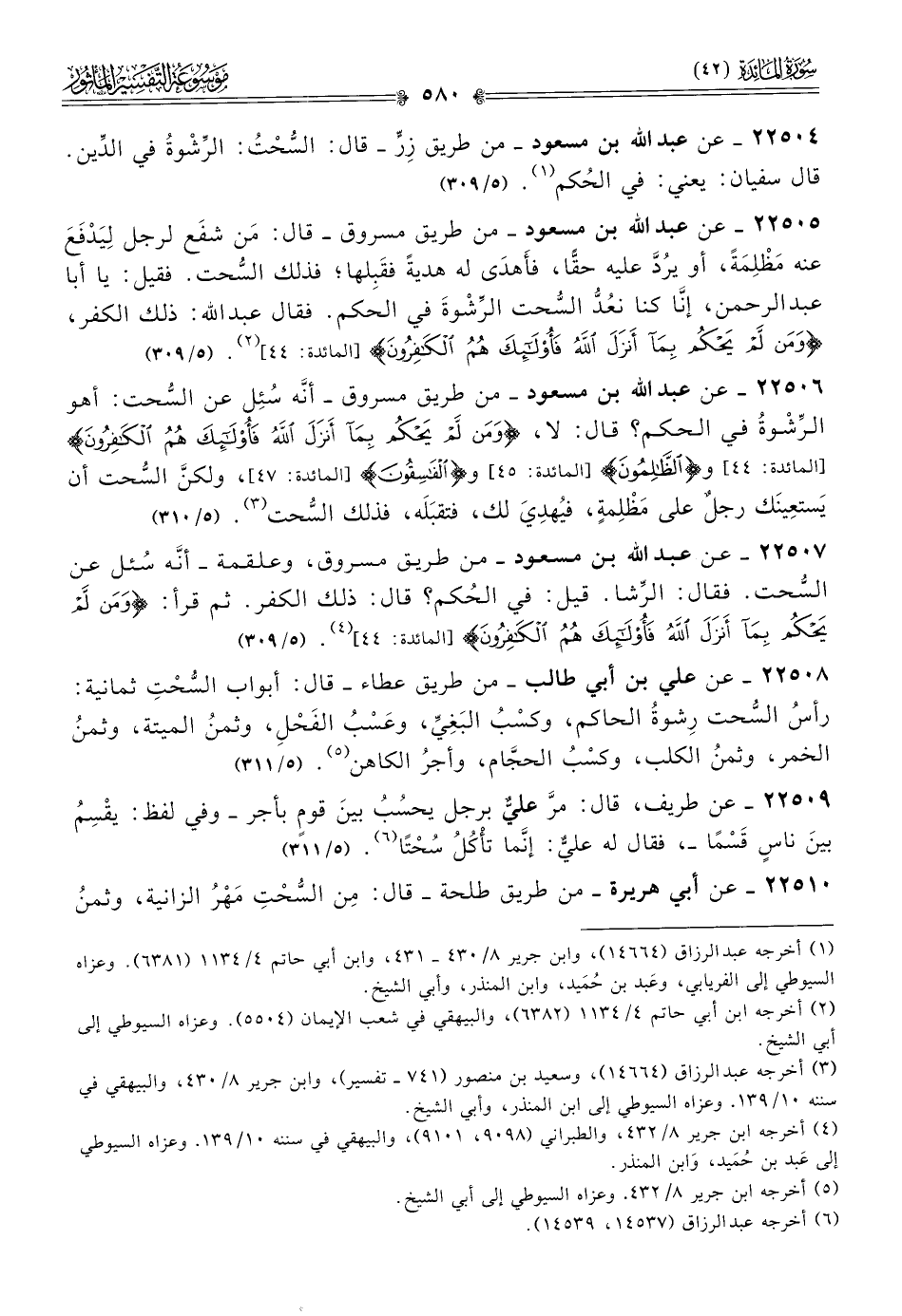 ٢٢٥٠٧ - عن عبد الله بن مسعود -من طريق مسروق، وعلقمة- أنّه سُئل عن السُّحت. فقال: الرِّشا. قيل: في الحُكم؟ قال: ذلك الكفر. ثم قرأ: {ومن لم يحكم بما أنزل الله فأولئك هم الكافرون} (¬٤). (٥/ ٣٠٩)