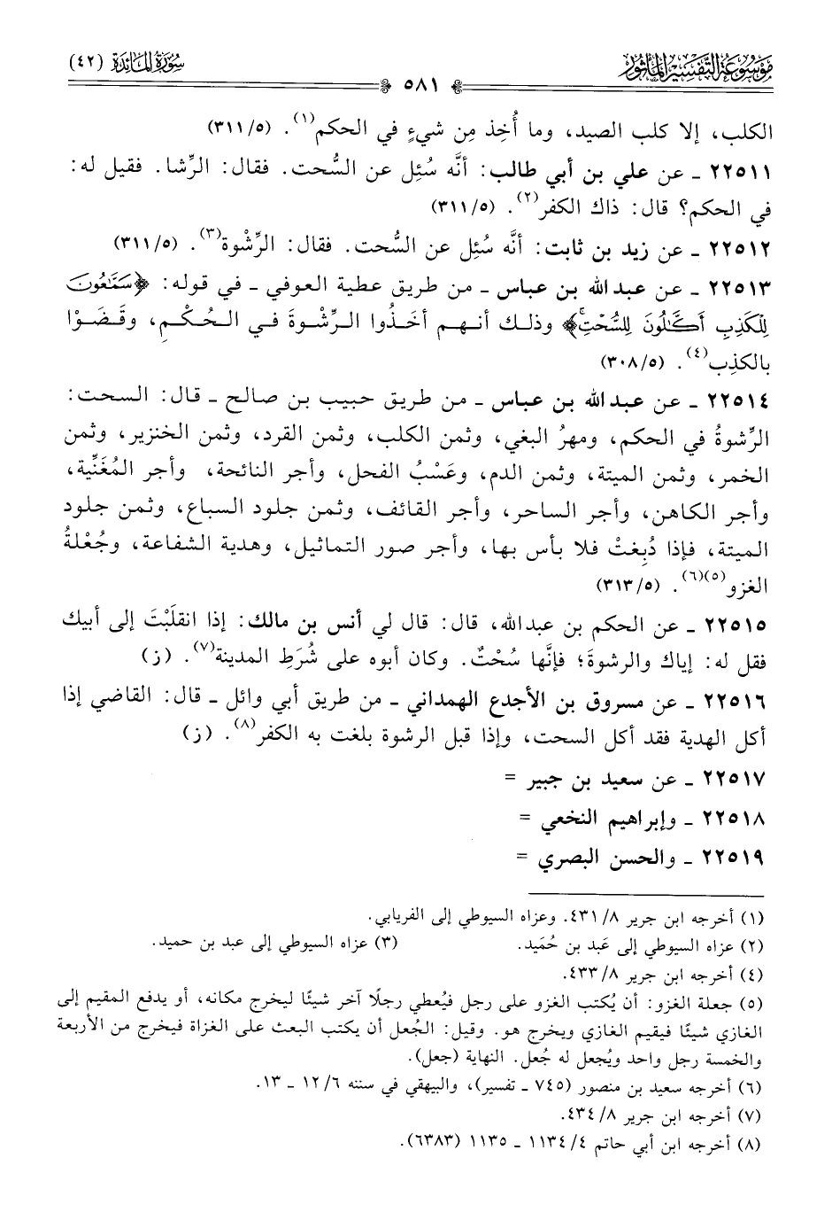 ٢٢٥١٣ - عن عبد الله بن عباس -من طريق عطية العوفي- في قوله: {سماعون للكذب أكالون للسحت} وذلك أنهم أخَذُوا الرِّشْوةَ في الحُكْمِ، وقَضَوْا بالكذِب (¬٤). (٥/ ٣٠٨)
