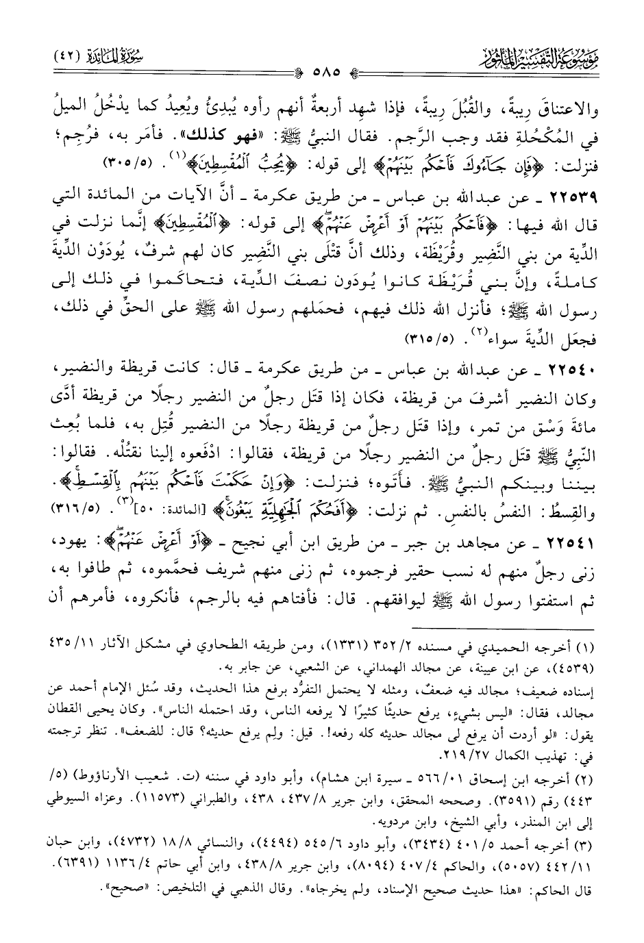 ٢٢٥٣٩ - عن عبد الله بن عباس -من طريق عكرمة- أنّ الآيات من المائدة التي قال الله فيها: {فاحكم بينهم أو أعرض عنهم} إلى قوله: {المقسطين} إنّما نزلت في الدِّية من بني النَّضِير وقُرَيْظَة، وذلك أنّ قتْلى بني النَّضِير كان لهم شرفٌ، يُودَوْن الدِّيةَ كاملةً، وإنّ بني قُرَيْظَة كانوا يُودَون نصفَ الدِّية، فتحاكَموا في ذلك إلى رسول الله - صلى الله عليه وسلم -؛ فأنزل الله ذلك فيهم، فحمَلهم رسول الله - صلى الله عليه وسلم - على الحقِّ في ذلك، فجعَل الدِّيةَ سواء (¬٢). (٥/ ٣١٥)