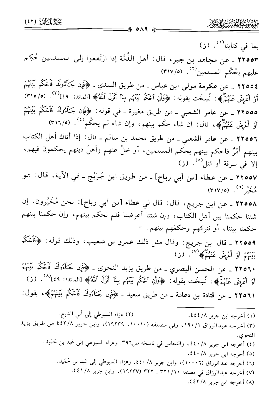 ٢٢٥٥٤ - عن عكرمة مولى ابن عباس -من طريق السدي- {فإن جاءوك فاحكم بينهم أو أعرض عنهم}: نُسِخَت بقوله: {وأن احكم بينهم بما أنزل الله} [المائدة: ٤٩] (¬٣). (٥/ ٣١٥)