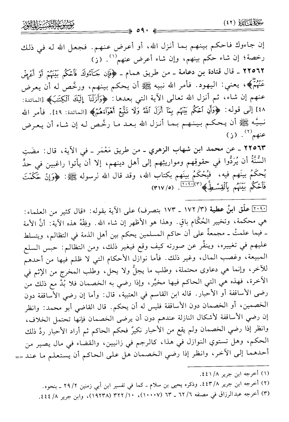 ٢٢٥٦٣ - عن محمد ابن شهاب الزهري -من طريق مَعْمَر- في الآية، قال: مضَتِ السُّنَّةُ أن يُرَدُّوا في حقوقِهم ومواريثِهم إلى أهل دينهم، إلا أن يأتوا راغبين في حدٍّ يُحكَمُ بينَهم فيه، فيُحْكَمُ بينَهم بكتاب الله، وقد قال الله لرسوله - صلى الله عليه وسلم -: {وإن حكمت فاحكم بينهم بالقسط} (¬٣) [٢٠٩٠]. (٥/ ٣١٧)