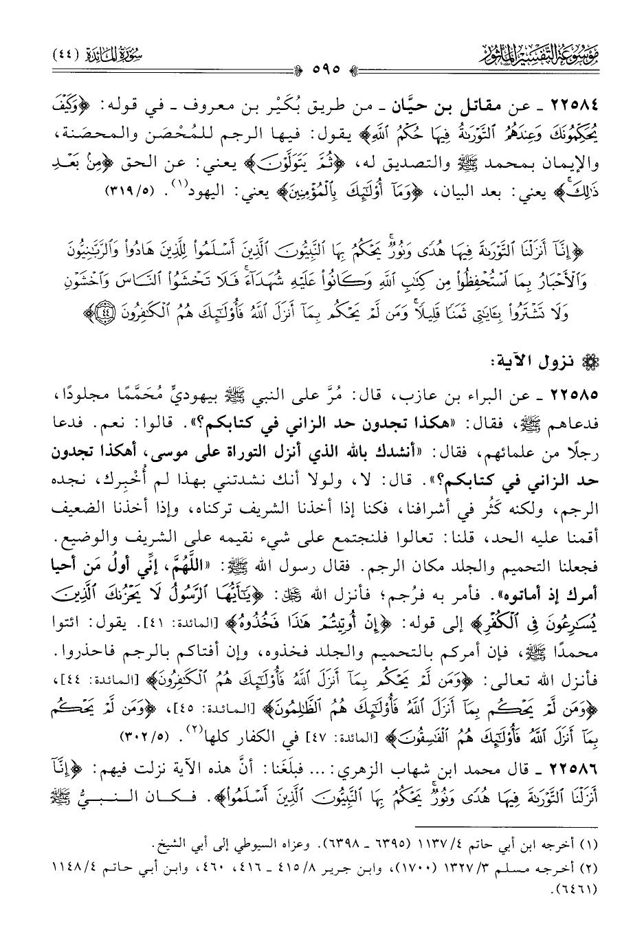 ٢٢٥٨٦ - قال محمد ابن شهاب الزهري: ... فبلَغَنا: أنّ هذه الآية نزلت فيهم: {إنا أنزلنا التوراة فيها هدى ونور يحكم بها النبيون الذين أسلموا}. فكان النبي - صلى الله عليه وسلم -