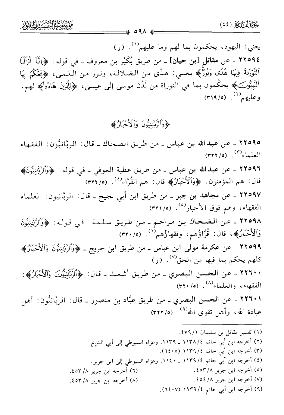 ٢٢٥٩٩ - عن عكرمة مولى ابن عباس -من طريق ابن جريج- {والربانيون والأحبار} كلهم يحكم بما فيها من الحق (¬٧). (ز)
