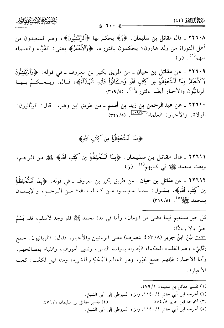 ٢٢٦٠٩ - عن مقاتل بن حيان -من طريق بكير بن معروف- في قوله: {والرَّبّانِيُّونَ والأَحْبارُ بِما اسْتُحْفِظُوا مِن كِتابِ اللَّهِ وكانُوا عَلَيْهِ شُهَداءَ}، قال: ويحكمُ بها الربانيُّون والأحبار أيضًا بالتوراة (¬٢). (٥/ ٣١٩)
