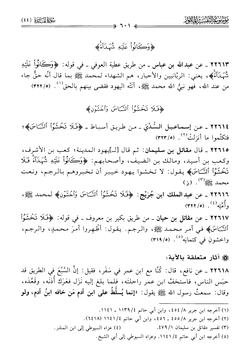 ٢٢٦١٤ - عن إسماعيل السُّدِّيّ -من طريق أسباط- {فلا تخشوا الناس}؛ فتكتُموا ما أنزلتُ (¬٢). (٥/ ٣٢٣)