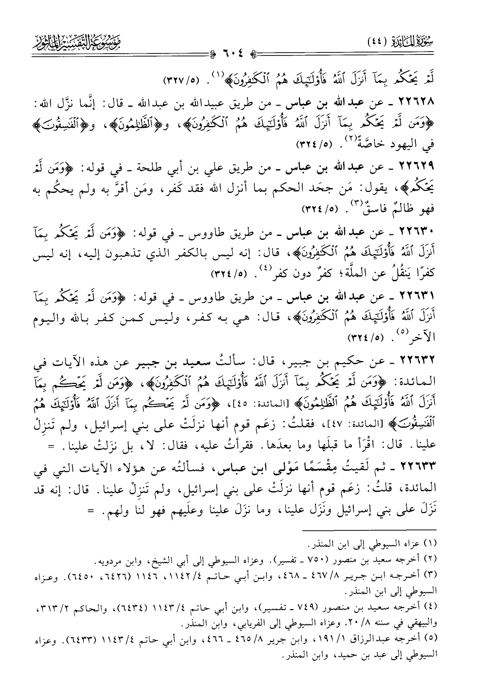 ٢٢٦٣١ - عن عبد الله بن عباس -من طريق طاووس- في قوله: {ومن لم يحكم بما أنزل الله فأولئك هم الكافرون}، قال: هي به كفر، وليس كمن كفر بالله واليوم الآخر (¬٥). (٥/ ٣٢٤)