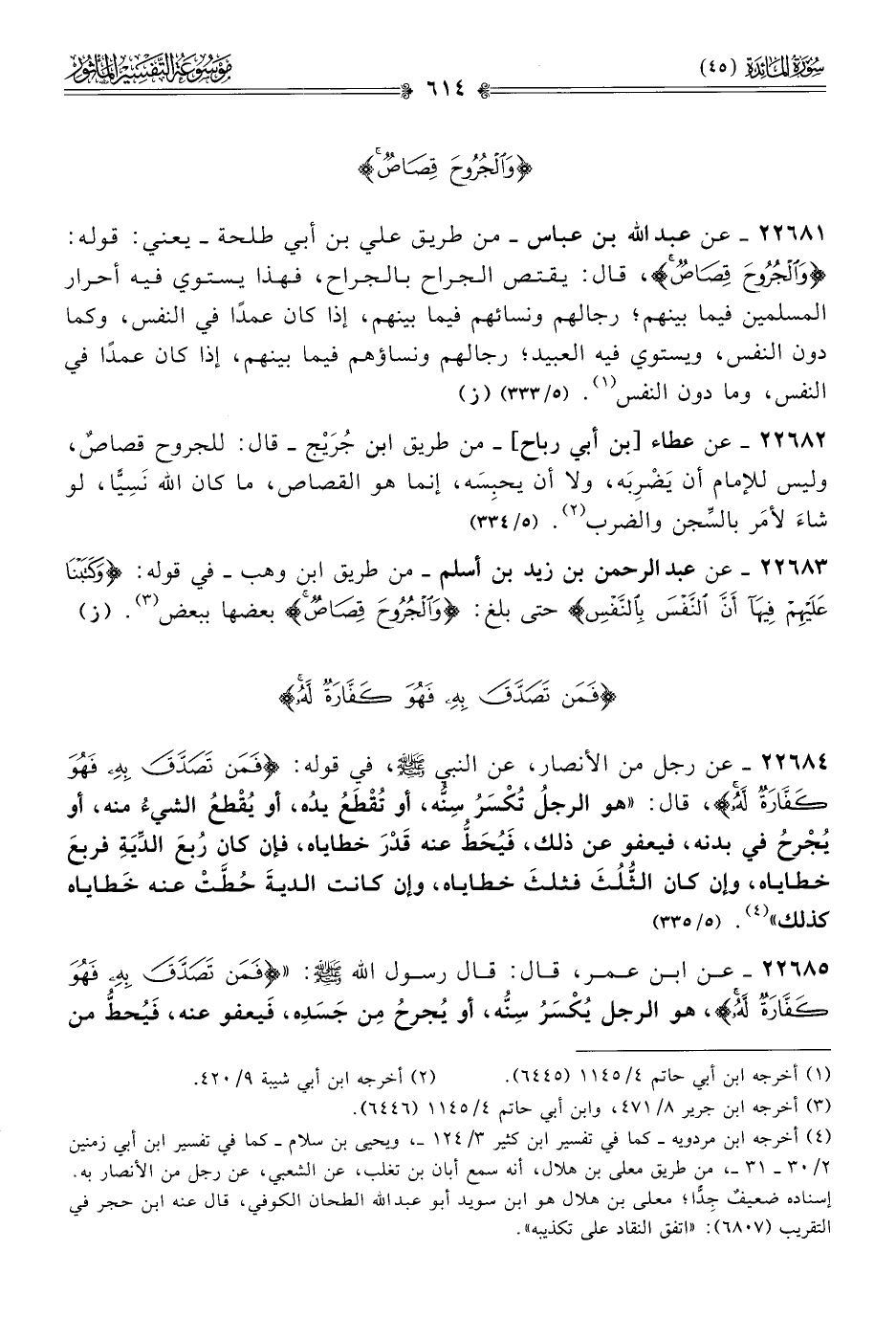 ٢٢٦٨١ - عن عبد الله بن عباس -من طريق علي بن أبي طلحة- يعني: قوله: {والجروح قصاص}، قال: يقتص الجراح بالجراح، فهذا يستوي فيه أحرار المسلمين فيما بينهم؛ رجالهم ونسائهم فيما بينهم، إذا كان عمدًا في النفس، وكما دون النفس، ويستوي فيه العبيد؛ رجالهم ونساؤهم فيما بينهم، إذا كان عمدًا في النفس، وما دون النفس (¬١). (٥/ ٣٣٣) (ز)
