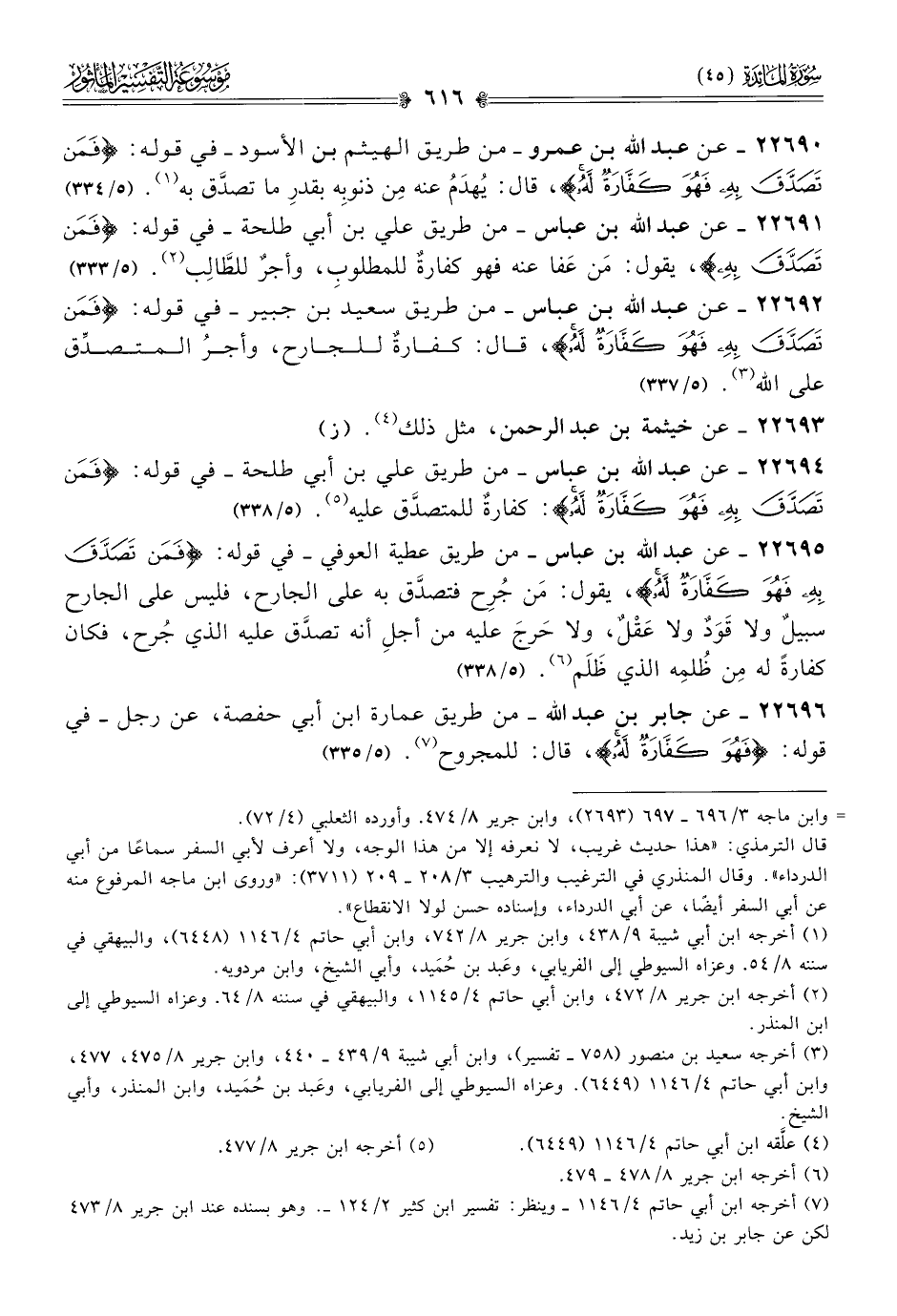 ٢٢٦٩١ - عن عبد الله بن عباس -من طريق علي بن أبي طلحة- في قوله: {فمن تصدق به}، يقول: مَن عَفا عنه فهو كفارةٌ للمطلوبِ، وأجرٌ للطّالِب (¬٢). (٥/ ٣٣٣)