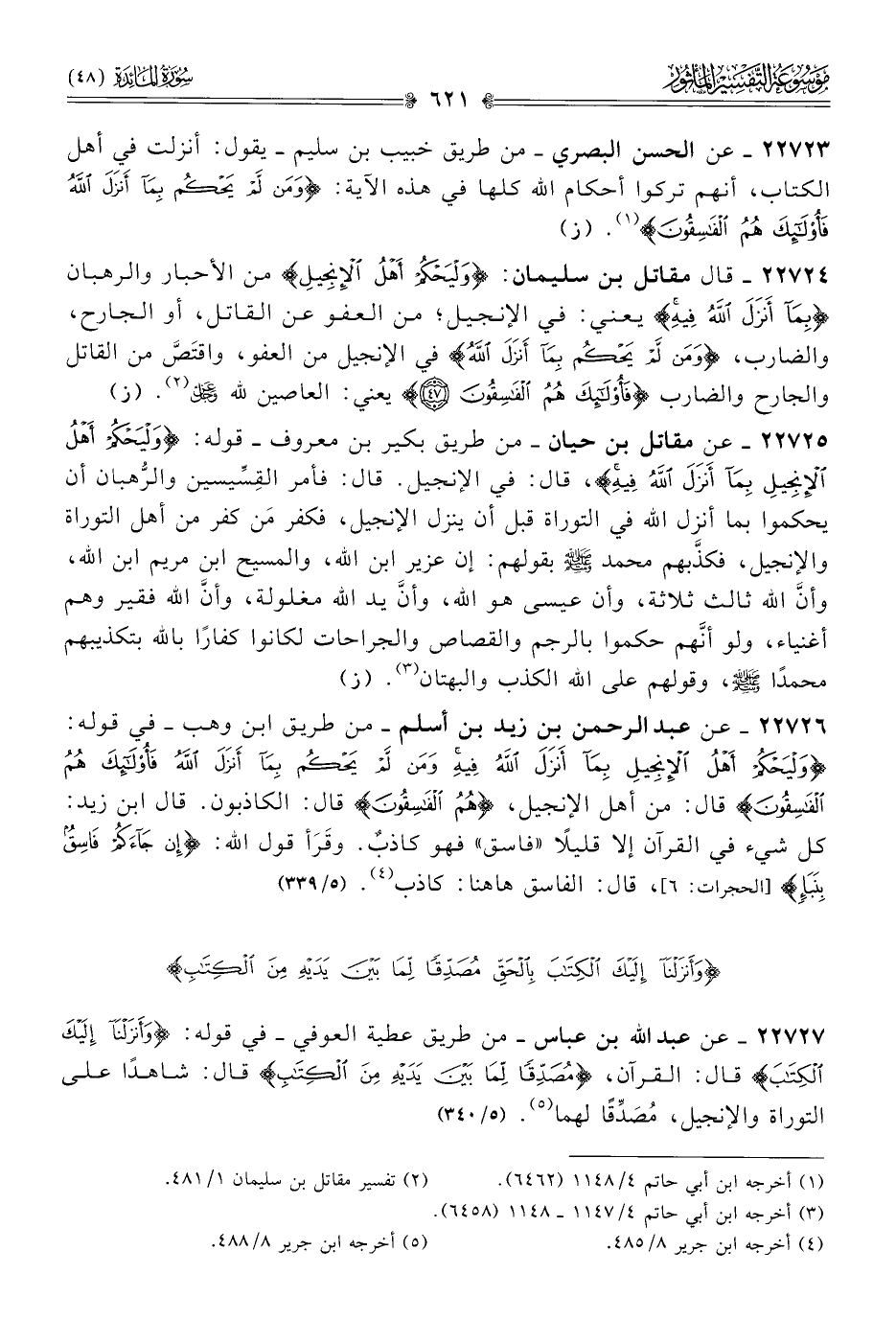 ٢٢٧٢٥ - عن مقاتل بن حيان -من طريق بكير بن معروف- قوله: {وليحكم أهل الإنجيل بما أنزل الله فيه}، قال: في الإنجيل. قال: فأمر القِسِّيسين والرُّهبان أن يحكموا بما أنزل الله في التوراة قبل أن ينزل الإنجيل، فكفر مَن كفر من أهل التوراة والإنجيل، فكذَّبهم محمد - صلى الله عليه وسلم - بقولهم: إن عزير ابن الله، والمسيح ابن مريم ابن الله، وأنّ الله ثالث ثلاثة، وأن عيسى هو الله، وأنّ يد الله مغلولة، وأنّ الله فقير وهم أغنياء، ولو أنّهم حكموا بالرجم والقصاص والجراحات لكانوا كفارًا بالله بتكذيبهم محمدًا - صلى الله عليه وسلم -، وقولهم على الله الكذب والبهتان (¬٣). (ز)