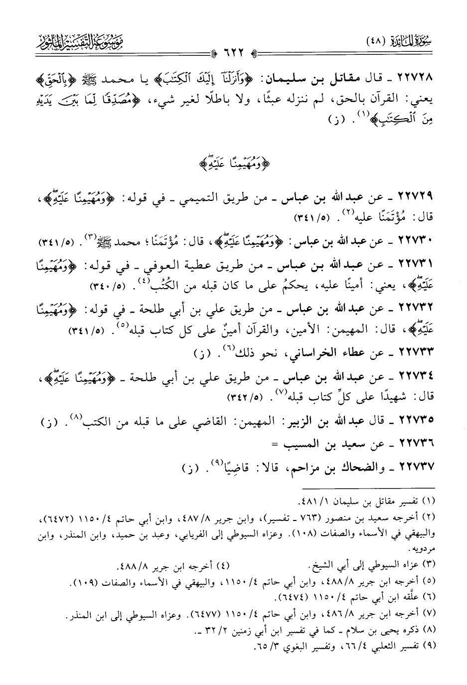 ٢٢٧٣٢ - عن عبد الله بن عباس -من طريق علي بن أبي طلحة- في قوله: {ومهيمنا عليه}، قال: المهيمن: الأمين، والقرآن أمينٌ على كل كتاب قبله (¬٥). (٥/ ٣٤١)