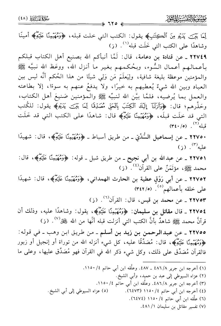 ٢٢٧٥٥ - عن عبد الرحمن بن زيد بن أسلم -من طريق ابن وهب- في قوله: {ومهيمنا عليه}، قال: مُصَدِّقًا عليه، كل شيء أنزله الله من توراة أو إنجيل أو زبور فالقرآن مُصَدِّق على ذلك، وكل شيء ذكر الله في القرآن فهو مُصَدِّق عليها، وعلى ما