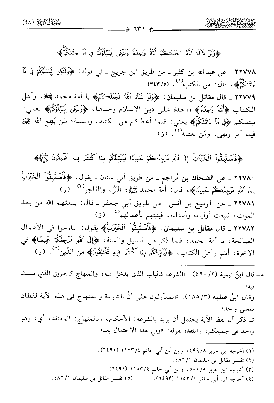 ٢٢٧٧٨ - عن عبد الله بن كثير -من طريق ابن جريج- في قوله: {ولكن ليبلوكم في ما آتاكم}، قال: من الكتب (¬١). (٥/ ٣٤٣)