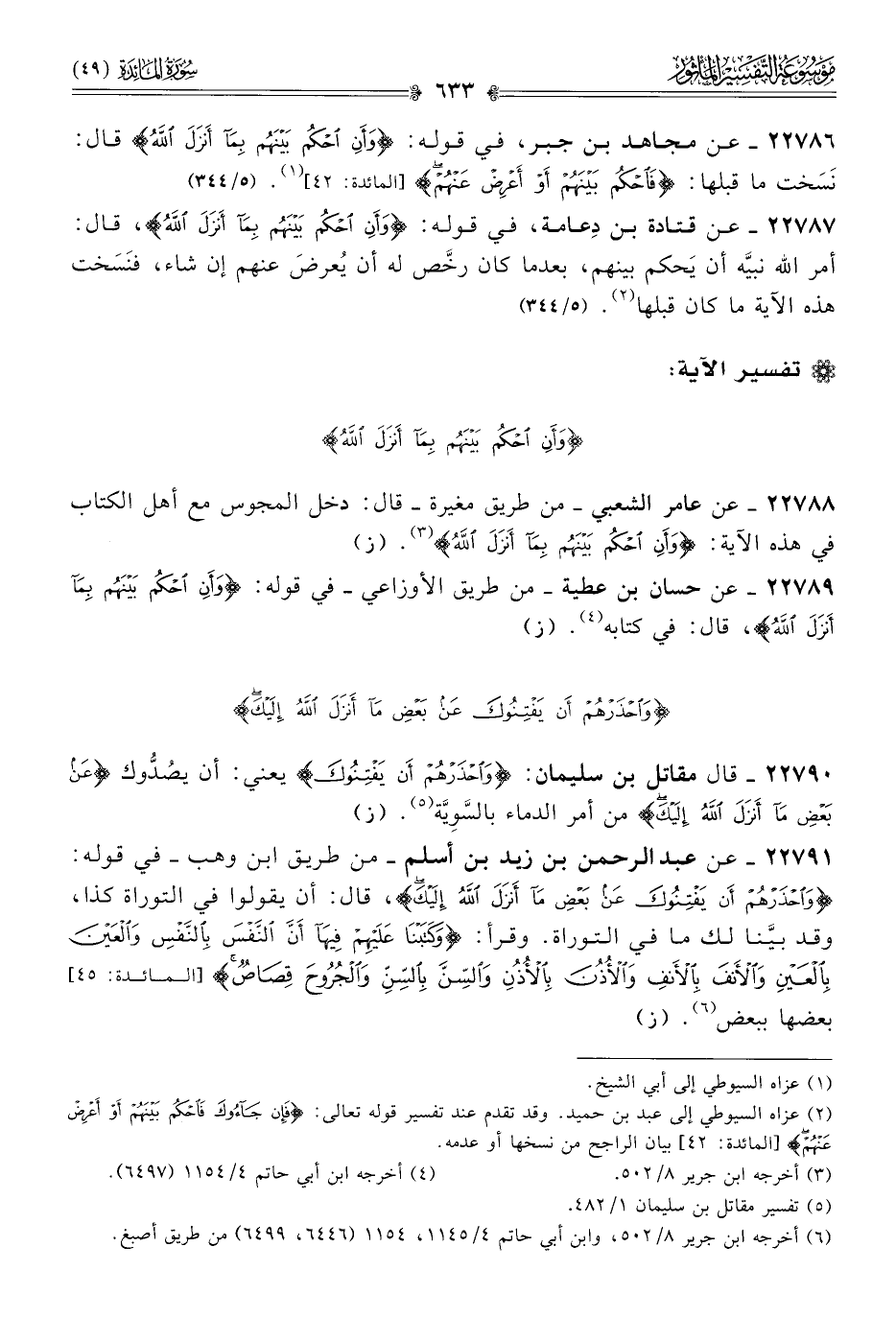 ٢٢٧٨٨ - عن عامر الشعبي -من طريق مغيرة- قال: دخل المجوس مع أهل الكتاب في هذه الآية: {وأن احكم بينهم بما أنزل الله} (¬٣). (ز)