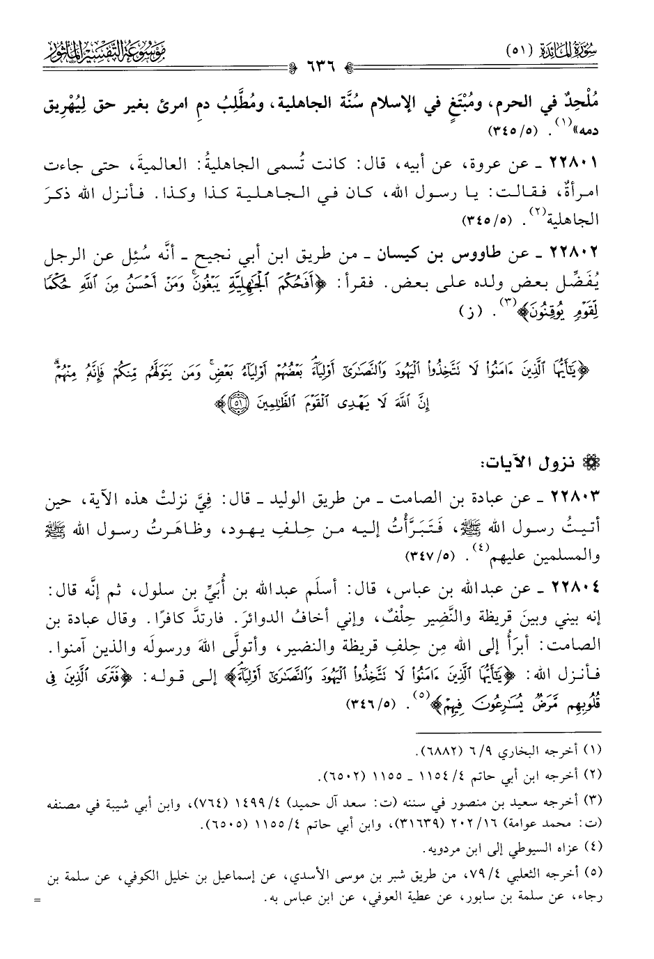 ٢٢٨٠٤ - عن عبد الله بن عباس، قال: أسلَم عبد الله بن أُبَيِّ بن سلول، ثم إنّه قال: إنه بيني وبينَ قريظة والنَّضِير حِلْفٌ، وإني أخافُ الدوائرَ. فارتدَّ كافرًا. وقال عبادة بن الصامت: أبرَأُ إلى الله مِن حِلفِ قريظة والنضير، وأتولّى اللهَ ورسوله والذين آمنوا. فأنزل الله: {يا أيها الذين آمنوا لا تتخذوا اليهود والنصارى أولياء} إلى قوله: {فترى الذين في قلوبهم مرض يسارعون فيهم} (¬٥). (٥/ ٣٤٦)