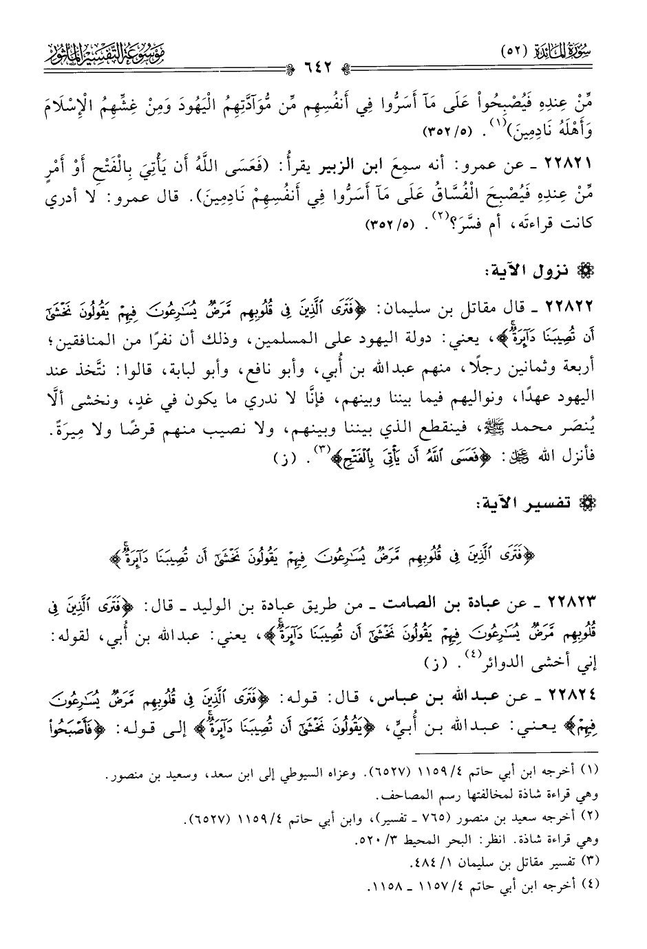 ٢٢٨٢٤ - عن عبد الله بن عباس، قال: قوله: {فترى الذين في قلوبهم مرض يسارعون فيهم} يعني: عبد الله بن أُبيٍّ، {يقولون نخشى أن تصيبنا دائرة} إلى قوله: {فأصبحوا