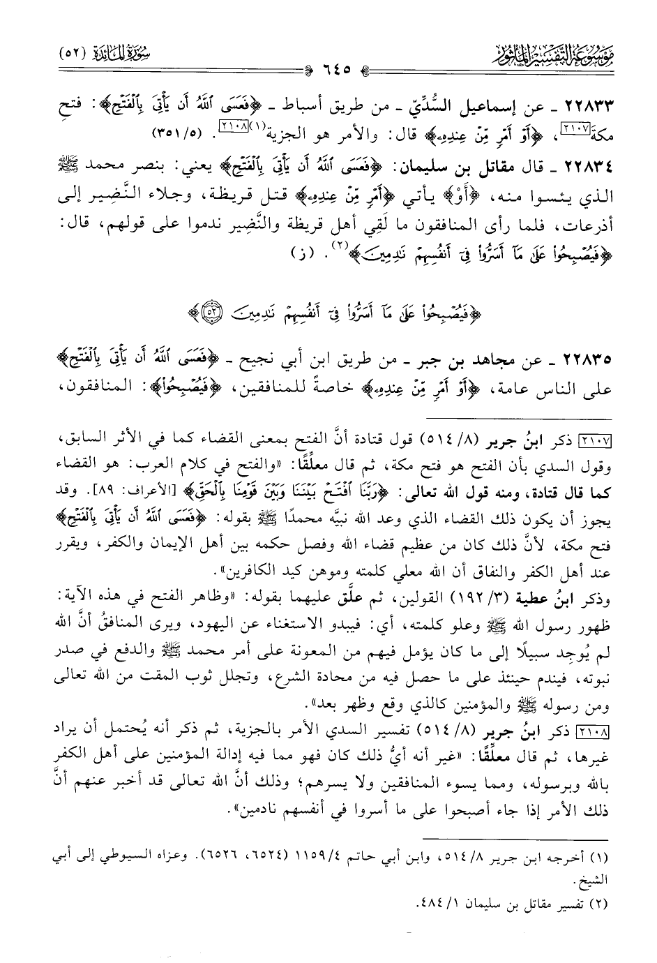 ٢٢٨٣٣ - عن إسماعيل السُّدِّيّ -من طريق أسباط- {فعسى الله أن يأتي بالفتح}: فتحِ مكةَ [٢١٠٧]، {أو أمر من عنده} قال: والأمر هو الجزية (¬١) [٢١٠٨]. (٥/ ٣٥١)