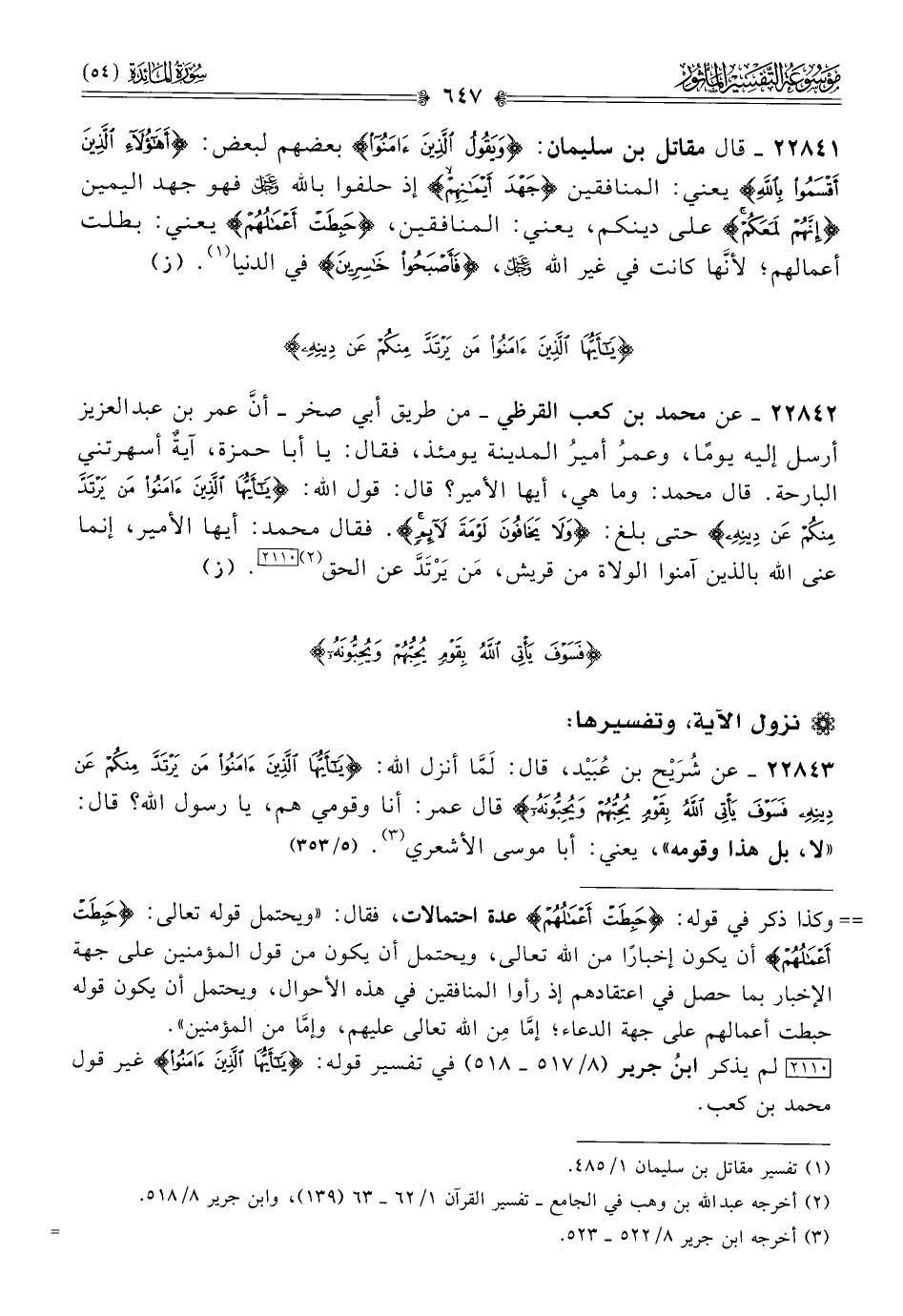 ٢٢٨٤١ - قال مقاتل بن سليمان: {ويَقُولُ الَّذِينَ آمَنُوا} بعضهم لبعض: {أهؤُلاءِ الَّذِينَ أقْسَمُوا بِاللَّهِ} يعني: المنافقين {جَهْدَ أيْمانِهِمْ} إذ حلفوا بالله - عز وجل - فهو جهد اليمين {إنَّهُمْ لَمَعَكُمْ} على دينكم، يعني: المنافقين، {حَبِطَتْ أعْمالُهُمْ} يعني: بطلت أعمالهم؛ لأنّها كانت في غير الله - عز وجل -، {فَأَصْبَحُوا خاسِرِينَ} في الدنيا (¬١). (ز)