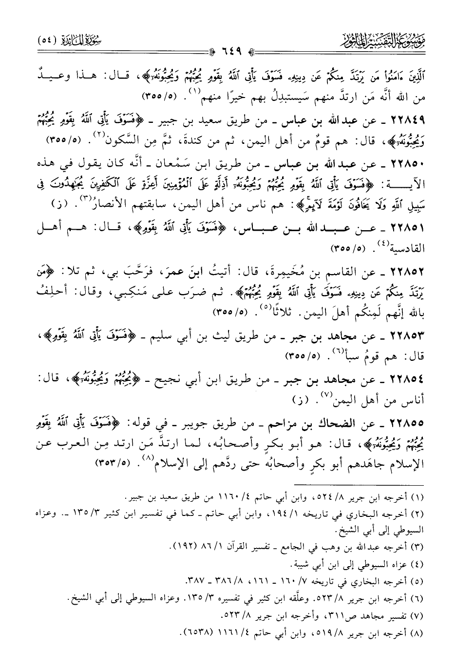 ٢٢٨٤٩ - عن عبد الله بن عباس -من طريق سعيد بن جبير- {فسوف يأتي الله بقوم يحبهم ويحبونه}، قال: هم قومٌ من أهل اليمن، ثم من كندةَ، ثمَّ مِن السَّكون (¬٢). (٥/ ٣٥٥)