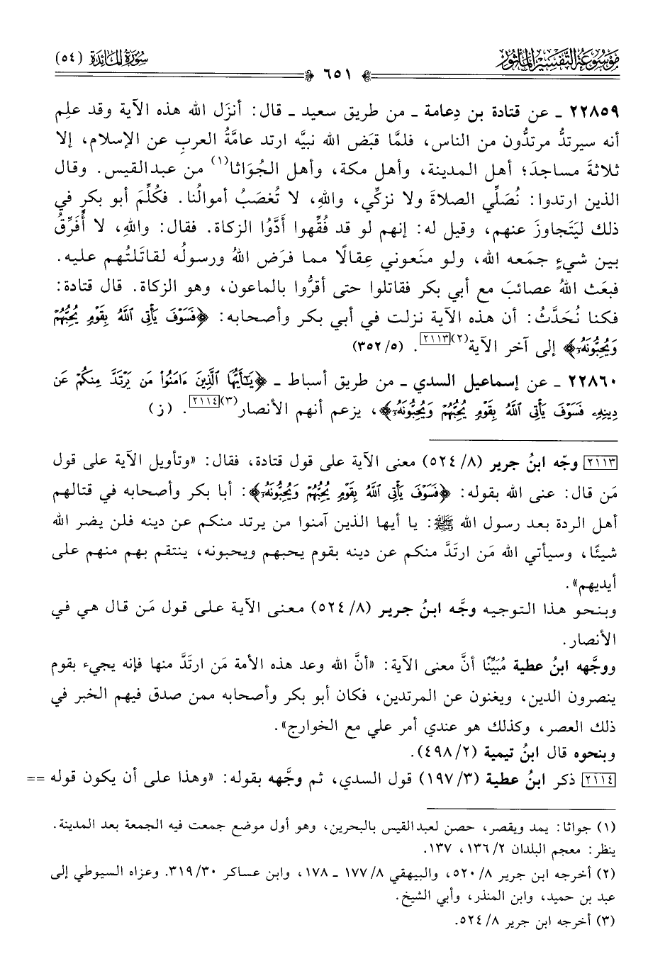 ٢٢٨٥٩ - عن قتادة بن دِعامة -من طريق سعيد- قال: أنزَل الله هذه الآية وقد علِم أنه سيرتدُّ مرتدُّون من الناس، فلمّا قبَض الله نبيه ارتد عامَّةُ العربِ عن الإسلام، إلا ثلاثةَ مساجدَ؛ أهل المدينة، وأهل مكة، وأهل الجُواثا (¬١) من عبد القيس. وقال الذين ارتدوا: نُصَلِّي الصلاةَ ولا نزكِّي، واللهِ، لا تُغصَبُ أموالُنا. فكُلِّمَ أبو بكرٍ في ذلك ليَتَجاوزَ عنهم، وقيل له: إنهم لو قد فُقِّهوا أدَّوُا الزكاة. فقال: واللهِ، لا أُفَرِّقُ بين شيءٍ جمَعه الله، ولو منَعوني عِقالًا مما فرَض اللهُ ورسوله لقاتَلتُهم عليه. فبعَث اللهُ عصائبَ مع أبي بكر فقاتلوا حتى أقرُّوا بالماعون، وهو الزكاة. قال قتادة: فكنا نُحَدَّثُ: أن هذه الآية نزلت في أبي بكر وأصحابه: {فسوف يأتي الله بقوم يحبهم ويحبونه} إلى آخر الآية (¬٢) [٢١١٣]. (٥/ ٣٥٢)