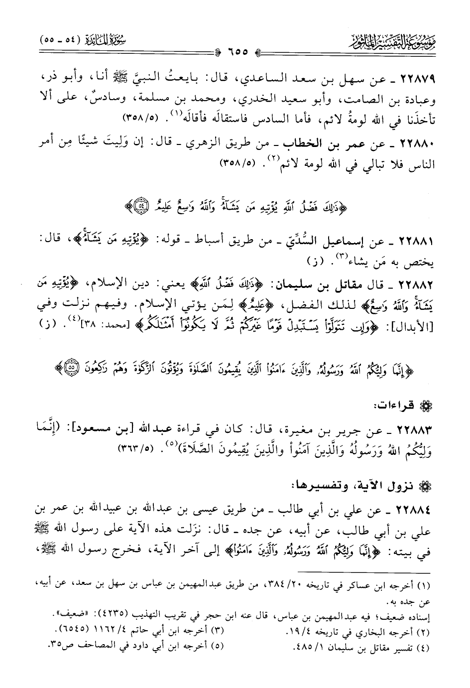 ٢٢٨٨٣ - عن جرير بن مغيرة، قال: كان في قراءة عبد الله [بن مسعود]: (إنَّما ولِيُّكُمُ اللَّهُ ورسولهُ والَّذِينَ آمَنُواْ والَّذِينَ يُقِيمُونَ الصَّلاةَ) (¬٥). (٥/ ٣٦٣)