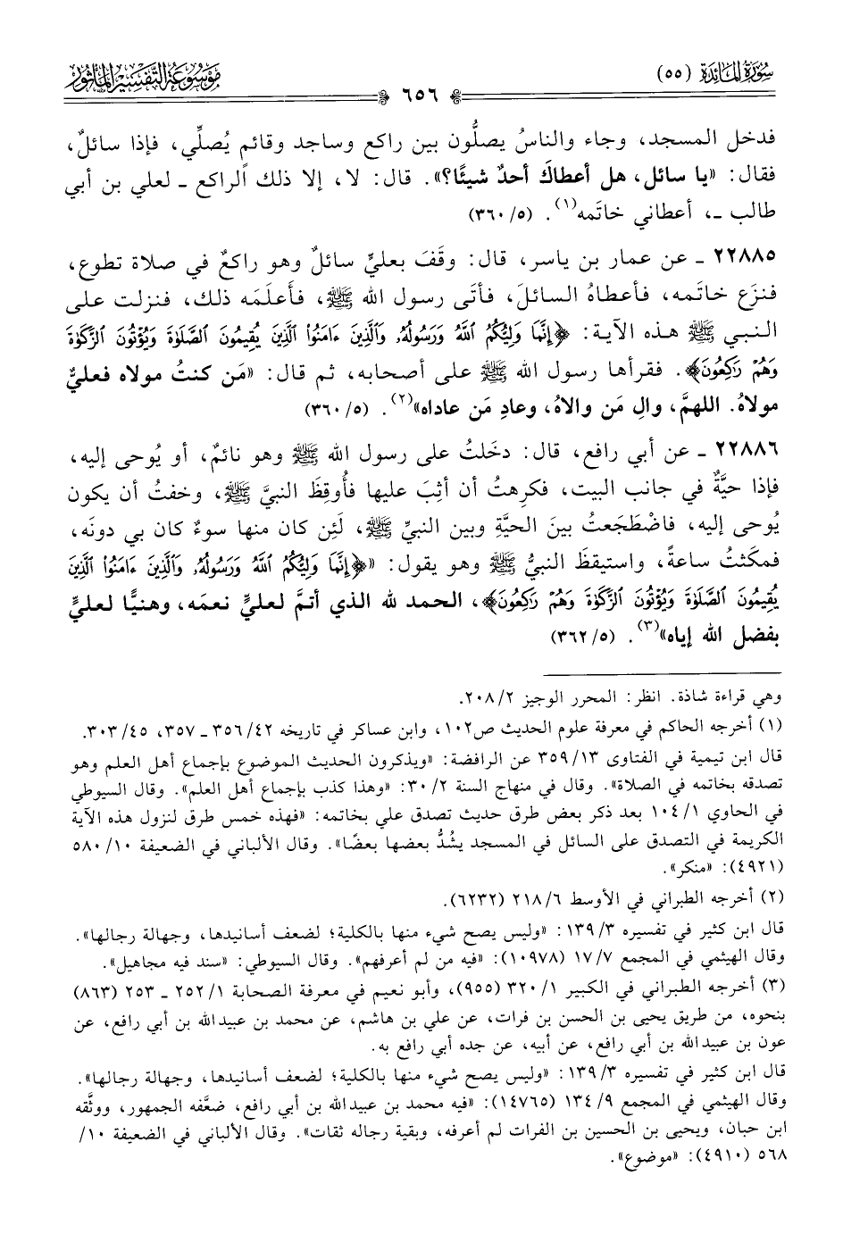 قال ابن تيمية في الفتاوى ١٣/ ٣٥٩ عن الرافضة: «ويذكرون الحديث الموضوع بإجماع أهل العلم وهو تصدقه بخاتمه في الصلاة». وقال في منهاج السنة ٢/ ٣٠: «وهذا كذب بإجماع أهل العلم». وقال السيوطي في الحاوي ١/ ١٠٤ بعد ذكر بعض طرق حديث تصدق علي بخاتمه: «فهذه خمس طرق لنزول هذه الآية الكريمة في التصدق على السائل في المسجد يشُدُّ بعضها بعضًا». وقال الألباني في الضعيفة ١٠/ ٥٨٠ (٤٩٢١): «منكر».