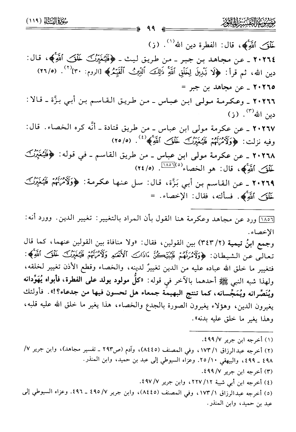٢٠٢٦٤ - عن مجاهد بن جبر -من طريق ليث- {فليغيرن خلق الله}، قال: دين الله. ثم قرأ: {لا تبديل لخلق الله ذلك الدين القيم} [الروم: ٣٠] (¬٢). (٥/ ٢٦)