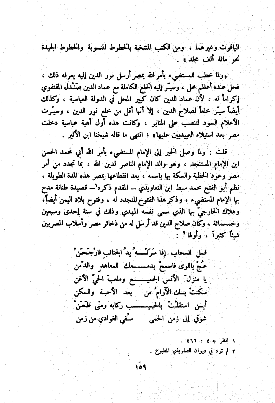 قلت: ولما وصل الخبر إلى الإمام المستضيء بأمر الله أبي محمد الحسن بن الإمام المستنجد، وهو والد الإمام الناصر لدين الله، بما تجدد من أمر مصر وعود الخطبة والسكة بها باسمه، بعد انقطاعها بمصر هذه المدة الطويلة، نظم أبو الفتح محمد سبط ابن التعاويذي - المقدم ذكره (1) - قصيدة طنانة مدح بها الإمام المستضيء، وذكر هذا الفتوح المتجدد له، وفتوح بلاد اليمن أيضاً، وهلاك الخارجي بها الذي سمى نفسه المهدي وذلك في سنة إحدى وسبعين وخمسمائة، وكان صلاح الدين قد أرسل له من ذخائر مصر وأسلاب المصريين شيئاً كثيراً، وأولها (2) :
