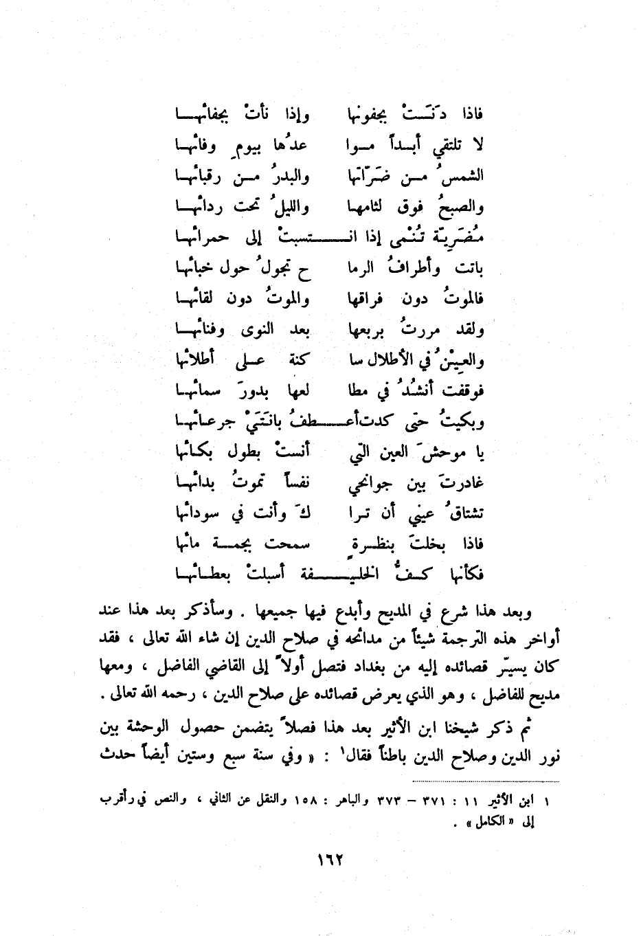 فإذا بخلت بنظرة ... سمحت بجمة مائها فكأنها كف الخليفة أسبلت بعطائها ... وبعد هذا شرع في المديح وأبدع فيها جميعها. وسأذكر بعد هذا عند أواخر هذه الترجمة شيئاً من مدائحه في صلاح الدين إن شاء الله تعالى، فقد كان يسير قصائده إليه من بغداد فتصل أولاً إلى القاضي الفاضل، ومعها مديح للفاضل، وهو الذي يعرض قصائده على صلاح الدين، رحمه الله تعالى.