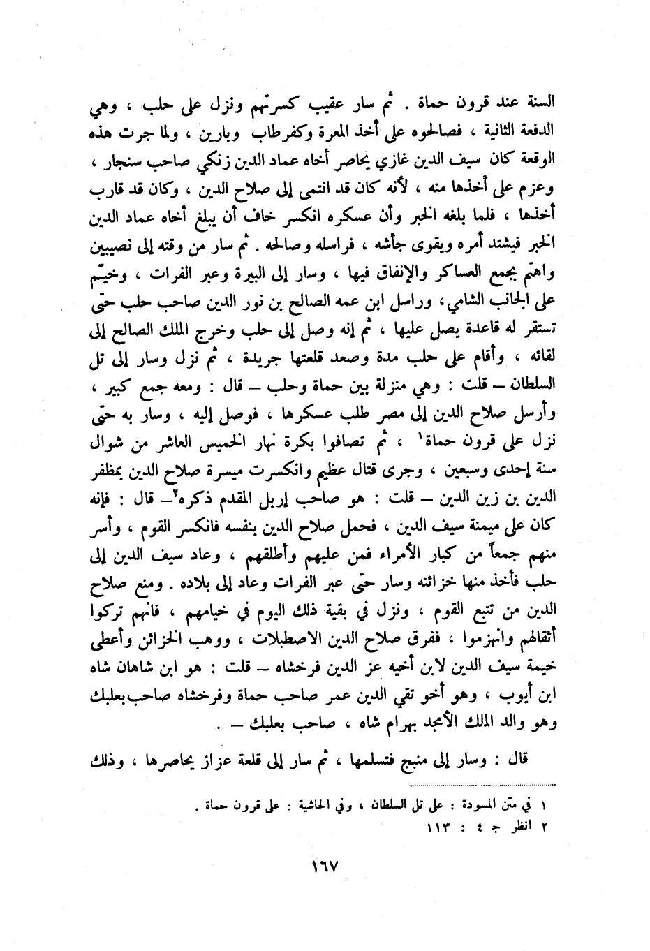 السنة عند قرون حماة. ثم سار عقيب كسرتهم ونزل على حلب، وهي الدفعة الثانية، فصالحوه على أخذ المعرة وكفر طاب وبارين، ولما جرت هذه الوقعة كان سيف الدين غازي يحاصر أخاه عماد الدين زنكي صاحب سنجار، وعزم على أخذها منه، لأنه كان قد انتمى إلى صلاح الدين، وكان قد قارب أخذها، فلما بلغه الخبر وأن عسكره انكسر خاف أن يبلغ أخاه عماد الدين الخبر فيشتد أمره ويقوى جأشه، فراسله وصالحه. ثم سار من وقته إلى نصيبين واهتم بجمع العساكر والإنفاق فيها، وسار إلى البيرة وعبر الفرات، وخيم على الجانب الشامي، وراسل ابن عمه الصالح بن نور الدين صاحب حلب حتى تستقر له قاعدة يصل عليها، ثم إنه وصل إلى حلب وخرج الملك الصالح إلى لقائه، وأقام على حلب مدة وصعد قلعتها جريدة، ثم نزل وسار إلى تل السلطان - قلت: وهي منزلة بين حماة وحلب - قال: ومعه جمع كبير، وأرسل صلاح الدين إلى مصر طلب عسكرها، فوصل إليه، وسار به حتى نزل على قرون حماة (1) ، ثم تصافوا بكرة نهار الخميس العاشر من شوال سنة إحدى وسبعين، وجرى قتال عظيم وانكسرت مسيرة صلاح الدين بمظفر الدين بن زين الدين - قلت: هو صاحب إربل المقدم ذكره (2) - قال: فإنه كان على ميمنة سيف الدين، فحمل صلاح الدين بنفسه فانكسر القوم، وأسر منهم جمعاً من كبار الأمراء فمن عليهم وأطلقهم، وعاد سيف الدين إلى حلب فأخذ منها خزائنه وسار حتى عبر الفرات وعاد إلى بلاده. ومنع صلاح الدين من تتبع القوم، ونزل في بقية ذلك اليوم في خيامهم، فإنهم تركوا أثقالهم وانهزموا، ففرق صلاح الدين الاصطبلات ووهب الخزائن وأعطى خيمة سيف الدين لابن أخيه عز الدين فرخشاه - قلت: هو ابن شاهان شاه بن أيوب، وهو أخو تقي الدين عمر صاحب حماة وفرخشاه صاحب بعلبك وهو والد الملك الأمجد بهرام شاه، صاحب بعلبك -.