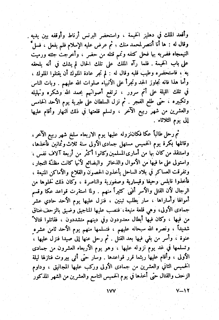 وأقعد الملك في دهليز الخيمة، واستحضر البرنس أرناط وأوقفه بين يديه وقال له: ها أنا أنتصر لمحمد منك، ثم عرض عليه الإسلام فلم يفعل، فسل النيمجاه فضربه بها فحل كتفه وتمم قتله من حضر، وأخرجت جثته ورميت على باب الخيمة. فلما رآه الملك على تلك الحال لم يشك في أنه يلحقه به، فاستحضره وطيب قلبه وقال له: لم تجر عادة الملوك أن يقتلوا الملوك. وأما هذا فإنه تجاوز الحد وتجرأ على الأنبياء صلوات الله عليهم، وبات الناس في تلك الليلة على أتم سرور، ترتفع أصواتهم بحمد الله وشكره وتهليله وتكبيره، حتى طلع الفجر. ثم نزل السلطان على طبرية يوم الأحد الخامس والعشرين من شهر ربيع الآخر، وتسلم قلعتها في ذلك النهار وأقام عليها إلى يوم الثلاثاء.