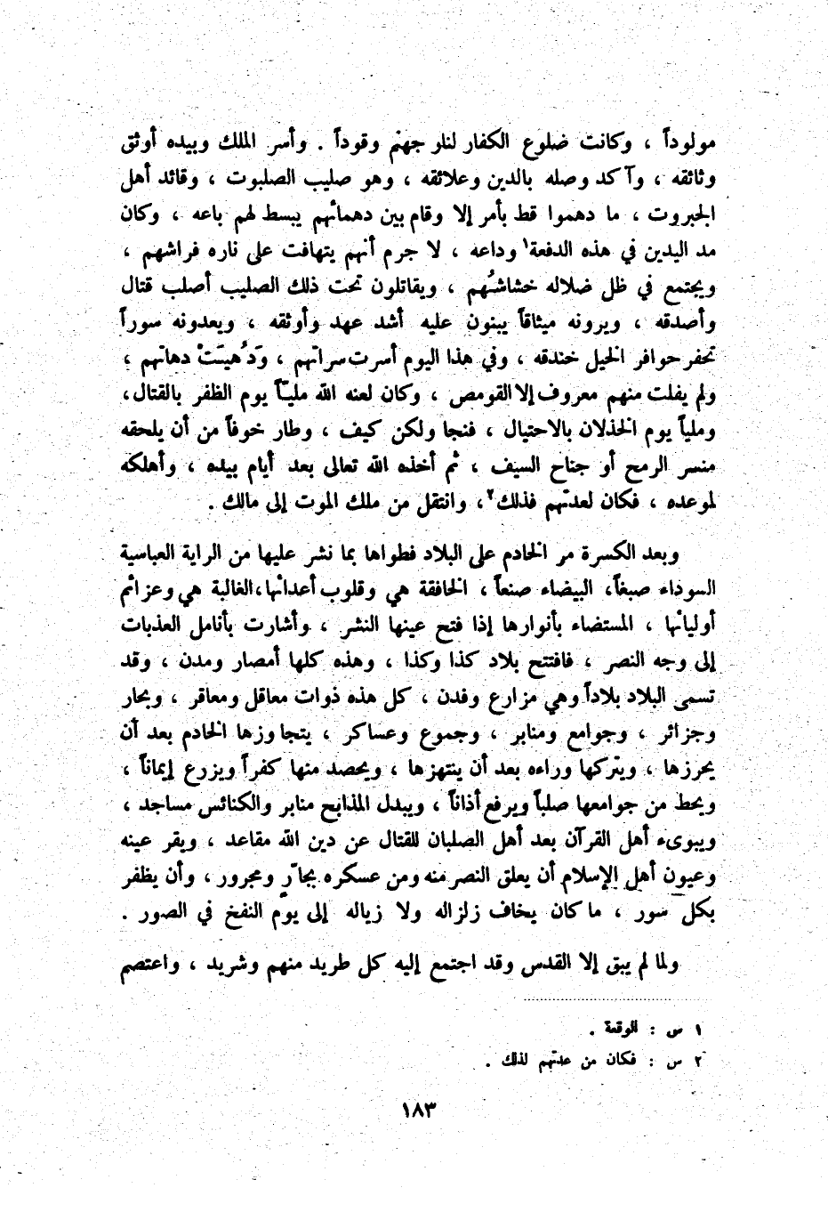 مولوداً، وكانت ضلوع الكفار لنار جهنم وقوداً، وأسر الملك وبيده أوثق وثائقه، وآكد وصله بالدين وعلائقه، وهو صليب الصلبوت، وقائد أهل الجبروت، ما دهموا قط بأمر إلا وقام بين دهمائهم يبسط لهم باعه، وكان مد اليدين في هذه الدفعة (1) وداعه، لا جرم أنهم يتهافت على ناره فراشهم، ويجتمع في ظل ضلاله خشاشهم، ويقاتلون تحت ذلك الصليب أصلب قتال وأصدقه، ويرونه ميثاقاً يبنون عليه أشد عهد وأوثقه، ويعدونه سوراً تحفر حوافر الخيل خندقه، وفي هذا اليوم أسرت سراتهم، ودهيت دهاتهم، ولم يفلت منهم معروف إلا القومص، وكان لعنه الله ملياً يوم الظفر بالقتال، وملياً يوم الخذلان بالاحتيال، فنجا ولكن كيف، وطار خوفاً من أن يلحقه منسر الرمح أو جناح السيف، ثم أخذه الله تعالى بعد أيام بيده، وأهلكه لموعده، فكان لعدتهم فذلك (2) ، وانتقل من ملك الموت إلى مالك.