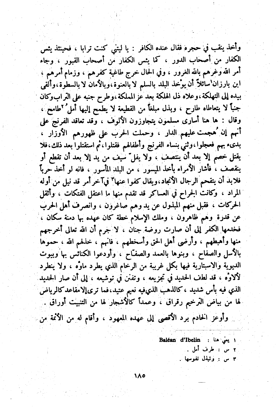 وأخذ ينقب في حجره فقال عنده الكافر: يا ليتني كنت تراباً، فحينئذ يئس الكفار من أصحاب الدور، كما يئس الكفار من أصحاب القبور، وجاء أمر الله وغرهم بالله الغرور، وفي الحال خرج طاغية كفرهم، وزمام أمرهم، ابن بارزان (1) سائلاً أن يؤخذ البلد بالسلم لا بالعنوة، وبالأمان لا بالسطوة، وألقى بيده إلى التهلكة، وعلاه ذل الهلكة بعد عز المملكة، وطرح جنبه على التراب وكان جنباً لا يتعاطاه طارح، وبذل مبلغاً من القطيعة لا يطمح إليها أمل (2) طامح، وقال: ها هنا أسارى مسلمون يتجاوزون الألوف، وقد تعاقد الفرنج على أنهم إن هجمت عليهم الدار، وحملت الحرب على ظهورهم الأوزار، بدىء بهم فعجلوا، وثني بنساء الفرنج وأطفالهم فقتلوا، ثم استقتلوا بعد ذلك، فلا يقتل خصم إلا بعد أن ينتصف، ولا يفل سيف من يد إلا بعد أن تقطع أو ينقصف، فأشار الأمراء بأخذ الميسور، من البلد المأسور، فإنه لو أخذ حرباً فلا بد أن يتقحم الرجال الأنجاد، ويقال كفوا عنها (3) في آخر أمر قد نيل من أوله المراد، وكانت الجراح في العساكر قد تقدم منها ما اعتقل الفتكات، وأثقل الحركات، فقبل منهم المبذول عن يد وهم صاغرون، وانصرف أهل الحرب عن قدرة وهم ظاهرون، وملك الإسلام خطة كان عهده بها دمنة سكان، فخدمها الكفر إلى أن صارت روضة جنان، لا جرم أن الله تعالى أخرجهم منها وأهبطهم، وأرضى أهل الحق وأسخطهم، فإنهم، خذلهم الله، حموها بالأسل والصفاح، وبنوها بالعمد والصفاح، وأودعوا الكنائس بها وبيوت الديوية والاستبارية فيها بكل غريبة من الرخام الذي يطرد ماؤه، ولا ينطرد لألاؤه، وقد لطف الحديد في تجزيعه، وتفنن في توشيعه، إلى أن صار الحديد الذي في بأس شديد، كالذهب الذي فيه نعيم عتيد، فما ترى إلا مقاعد كالرياض لها من بياض الترخيم رقراق، وعمداً كالأشجار لها من التنبيت أوراق.