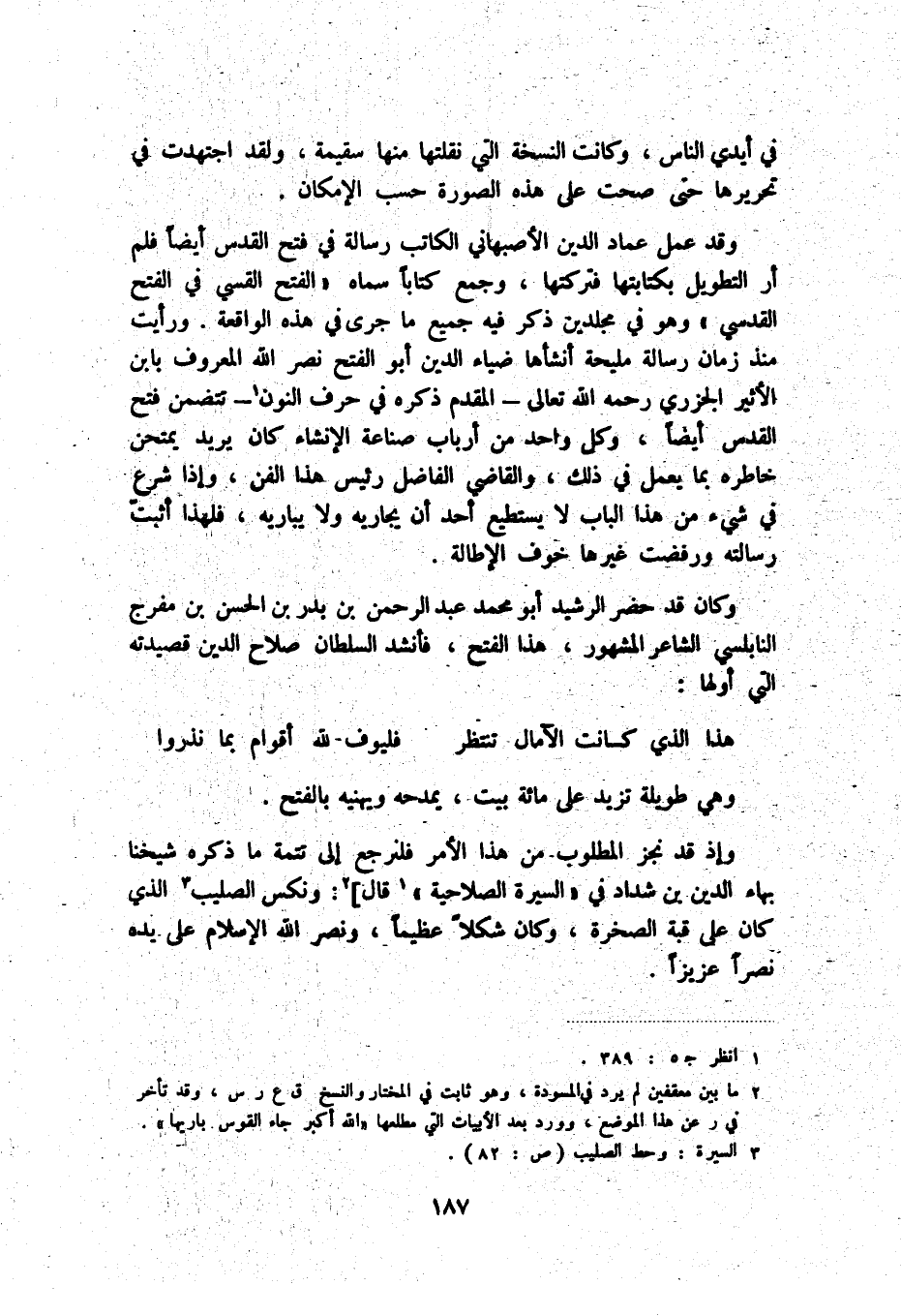 وقد عمل عماد الدين الأصبهاني الكاتب رسالة في فتح القدس أيضاً فلم أر التطويل بكتابتها فتركتها، وجمع كتاباً سماه " الفتح القسي في الفتح القدسي " وهو في مجلدين ذكر فيه جميع ما جرى في هذه الواقعة. ورأيت منذ زمان رسالة مليحة أنشأها ضياء الدين أبو الفتح نصر الله المعروف بابن الأثير الجزري رحمه الله تعالى - المقدم ذكره في حرف النون - تتضمن فتح القدس أيضاً، وكل واحد من أرباب صناعة الإنشاء كان يريد يمتحن خاطره بما يعمل في ذلك، والقاضي الفاضل رئيس هذا الفن، وإذا شرع في شيء من هذا الباب لا يستطيع أحد أن يجاريه ولا يباريه، فلهذا أثبت رسالته ورفضت غيرها خوف الإطالة.
