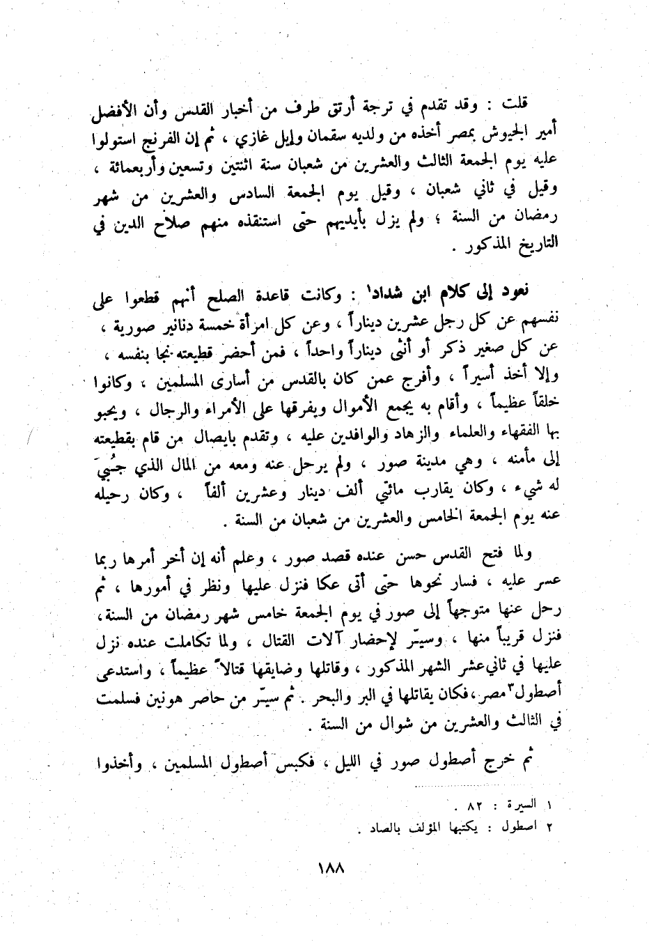 قلت: وقد تقدم في ترجة أرتق طرف من أخبار القدس وأن الأفضل أمير الجيوش بمصر أخذه من ولديه سقمان وإيل غازي، ثم إن الفرنج استولوا عليه يوم الجمعة الثالث والعشرين من شعبان سنة اثنتين وتسعين وأربعمائة، وقيل في ثاني شعبان، وقيل يوم الجمعة السادس والعشرين من شهر رمضان من السنة؛ ولم يزل بأيديهم حتى استنقذه منهم صلاح الدين في التاريخ المذكور.