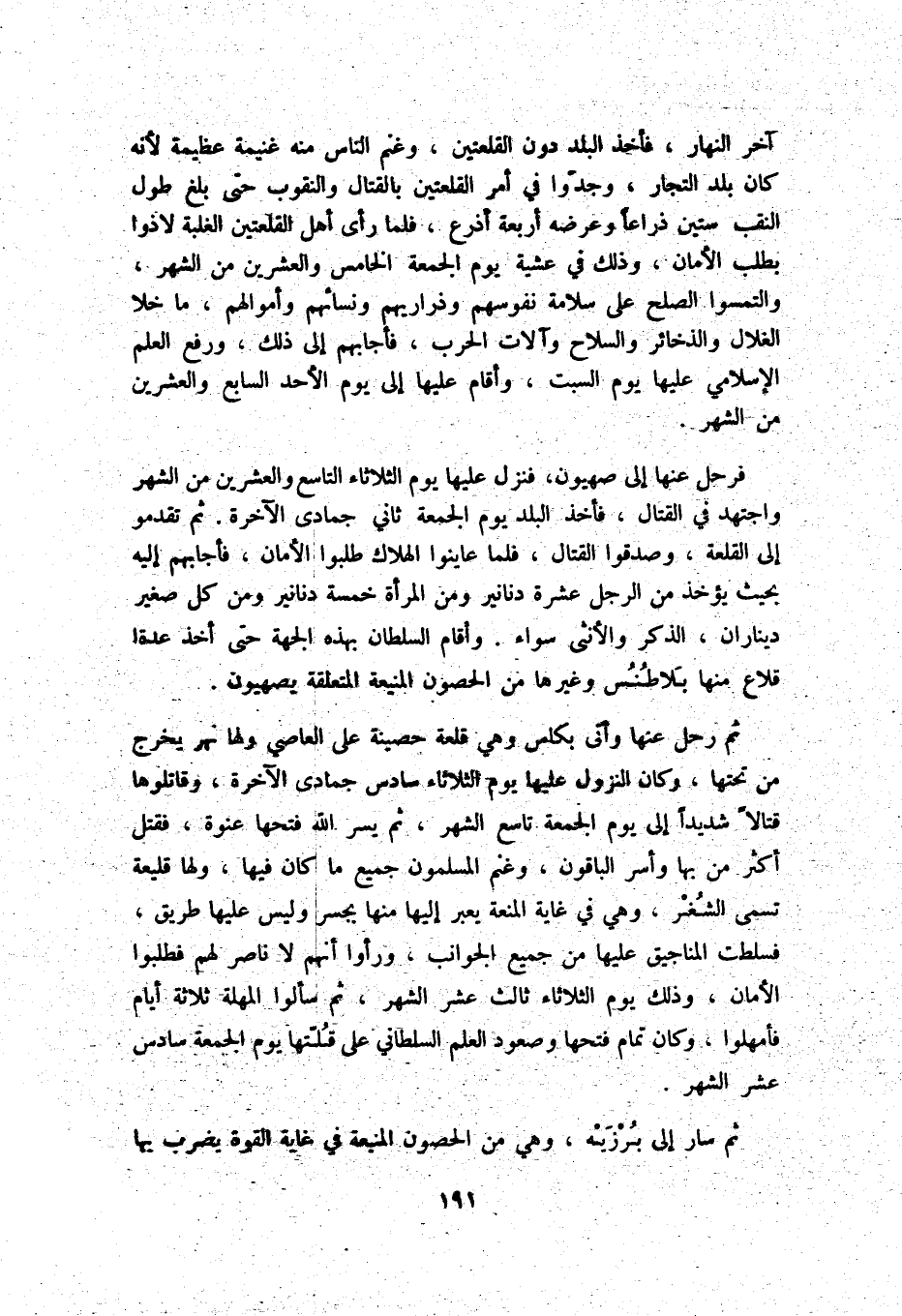 آخر النهار، فأخذ البلد دون القلعتين، وغنم الناس منه غنيمة عظيمة لأنه كان بلد التجار، وجدوا في أمر القلعتين بالقتال والنقوب حتى بلغ طول النقب ستين ذراعاً وعرضه أربعة أذرع، فلما رأى أهل القلعتين الغلبة لاذوا بطلب الأمان، وذلك في عشية يوم الجمعة الخامس والعشرين من الشهر، والتمسوا الصلح على سلامة نفوسهم وذراريهم ونسائهم وأموالهم، ما خلا الغلال والذخائر والسلاح وآلات الحرب، فأجابهم إلى ذلك، ورفع العلم الإسلامي عليها يوم السبت، وأقام عليها إلى يوم الأحد السابع والعشربن من الشهر.